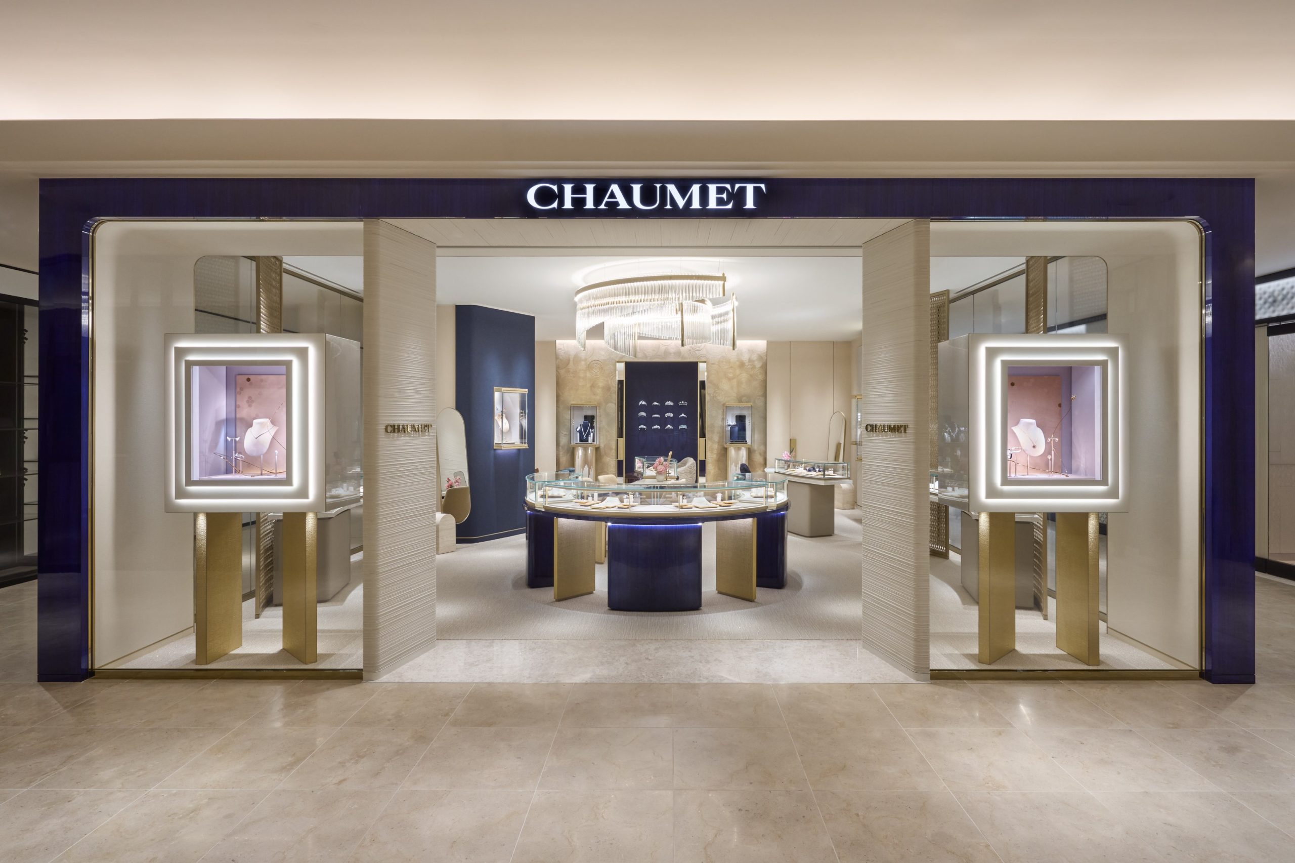 店内のデザインは、ショーメが大切にする「自然主義」の哲学を反映。インテリアは柔らかく有機的なフォルムと硬質な形状を巧みに組み合わせ、自然がもつダイナミズムと秩序ある調和の美しさを表現しています。壁面を彩るフレスコ画は、ショーメの象徴的なブルーや豊かな自然のモチーフといった伝統的な要素を現代的な感性で昇華させたデザインです。