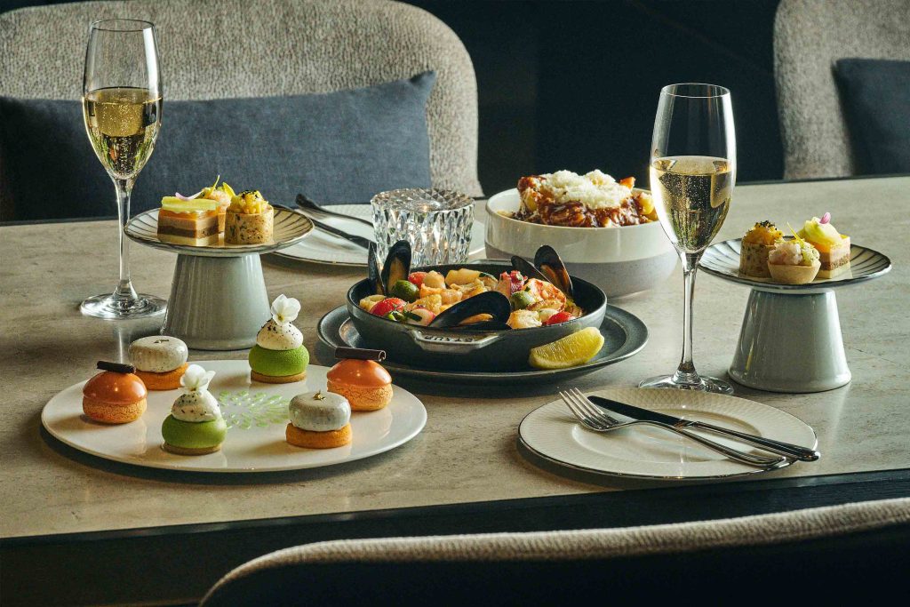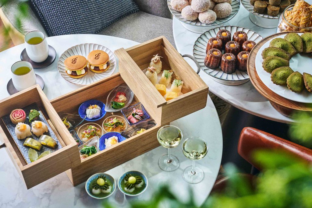 ランチとしても楽しめる「和のアフタヌーンティー」は、匠の技が冴えわたる構成に。同ホテルの鮨「みぎわ」と鉄板焼「燈辻」の料理長が監修したセイボリーは、日本の感性ならではの清澄な余韻を感じさせます。