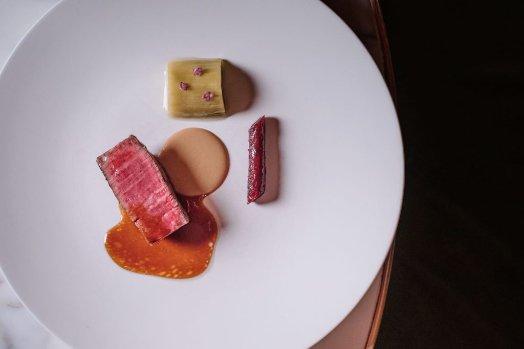 魚料理には、長崎県産の旨味豊かな希少魚・筋荒を、大分の芹とともに爽やかな酸味のトマトで。そしてメインディッシュには、上質な脂と肉質を誇る鹿児島県産の黒牛が、赤茄子や香ばしい新牛蒡を添えて提供されます。