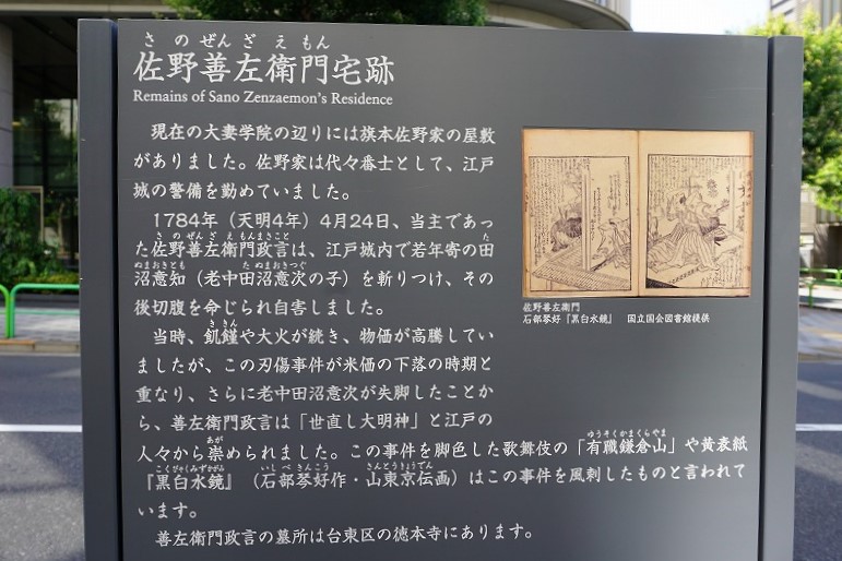 今度はAさんが驚く番でした。私が勤める出版社は当時、東京都千代田区三番町にありました。同じ三番町に大妻(おおつま)学院があり、学校周辺が旗本佐野家の屋敷跡です。御厩谷坂(おんまやだにざか)に面する校門付近に「佐野善左衛門宅跡」の標識が建ち、私は通りすがりに眺めて、田沼意知を斬ったことで、「世直し大明神」とあがめられたという佐野の名前を覚えていました。