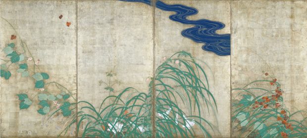 俳諧をたしなんでいた抱一は、あらかじめ考えていた「中秋良夜瓢風驟雨(ちゅうしゅうりょうやひょうふうしゅうう)」の言葉をもとに、月のきれいな秋の夜と激しい風雨の後の野を描きました。右隻は夕立の後で左隻は野分(のわけ。今でいう台風)の後。銀地は、右隻では雨を、左隻では月夜を表し、右から左にかけて過ぎ行く季節を、繊細な草花で表現しました。本来、右隻から左隻にかけて春夏秋冬を描く屏風も二曲一双では自由になり、抱一はその特性を最大限生かして傑作をものにしたのです。