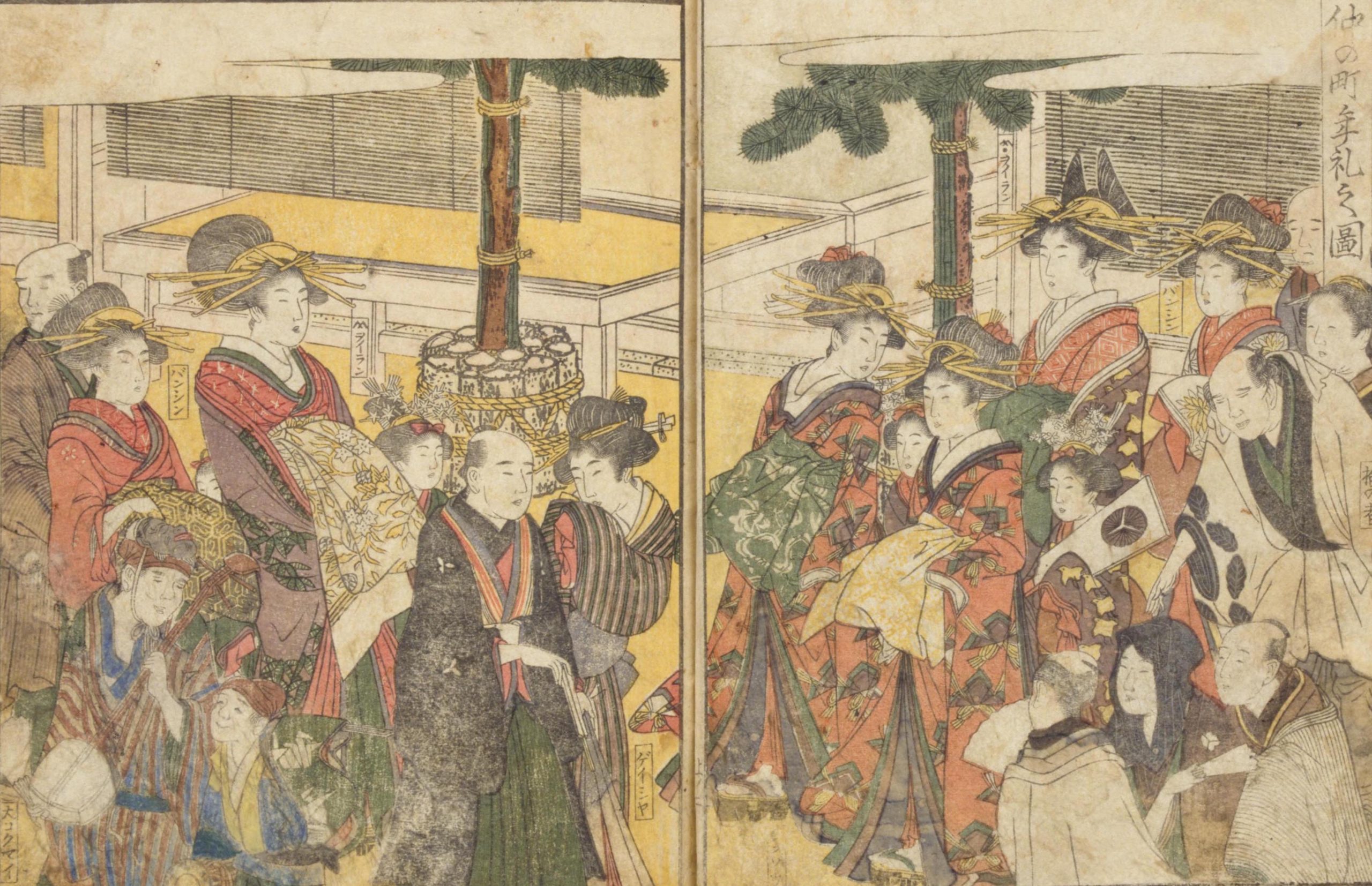 『青楼絵本年中行事(せいろうえほんねんじゅうぎょうじ))』は正月2日、女郎たちが郭内の各所に年始挨拶に回る「年礼」の花魁道中が、子どもや夫婦連れの江戸町人、地方から物見遊山でやって来る観光客でごった返していたと記しています。