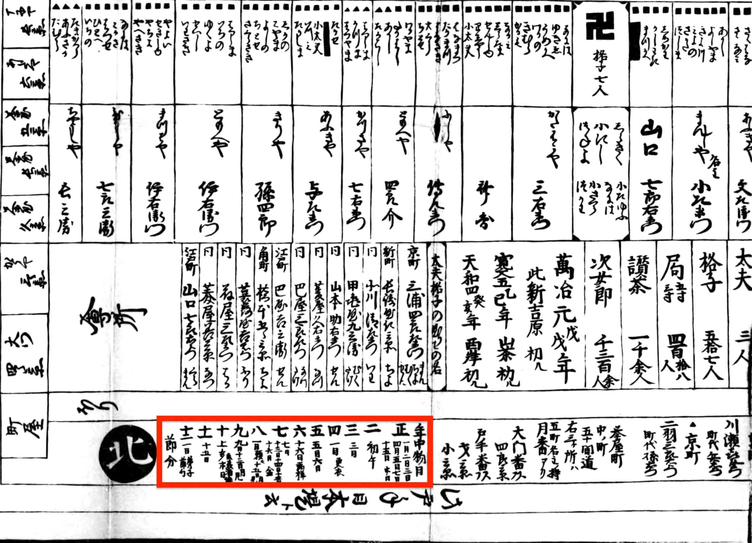 紋日の起源は、はっきりしません。ただし、元禄2(1689)年には徳川家康の江戸入府を記念した「八朔(はっさく)」をはじめ、27日の紋日があったことが『絵入大画図(えいりおおえず)』で確認できます(写真下の赤枠箇所)。