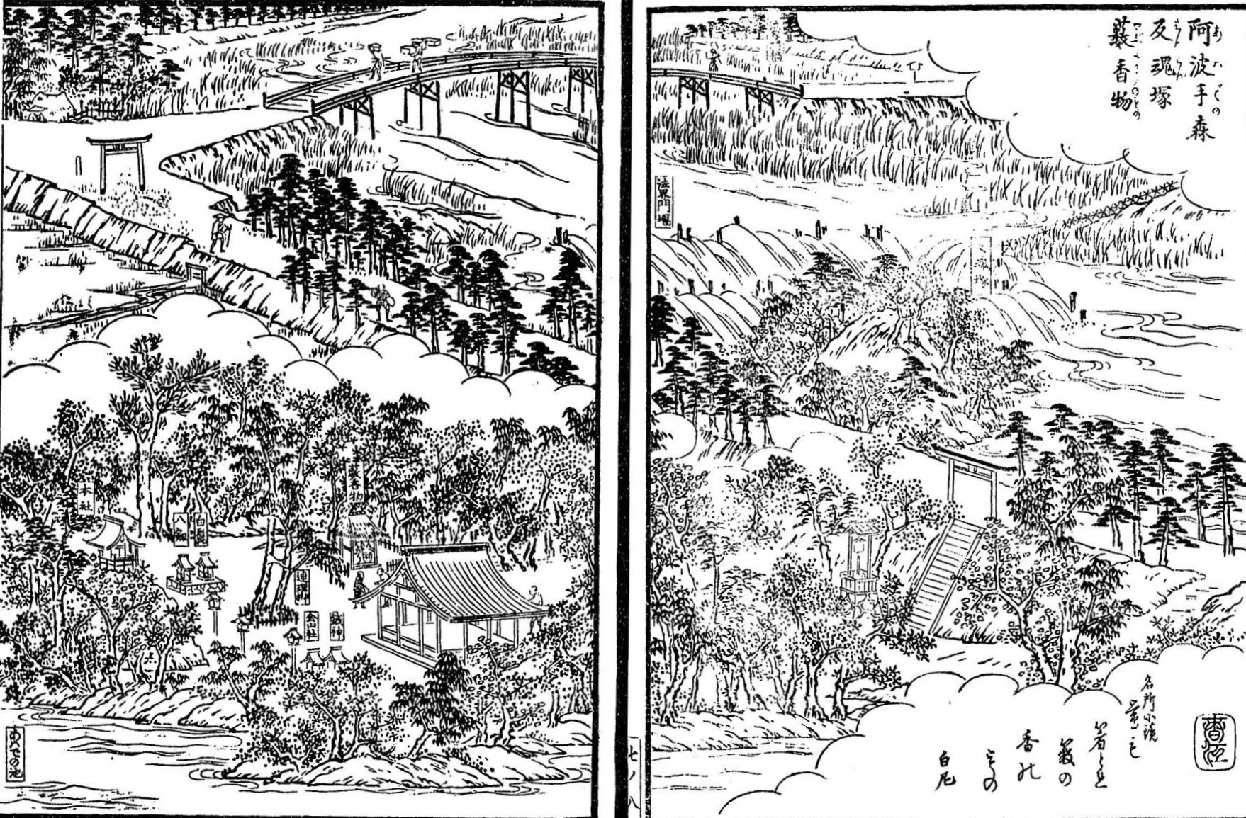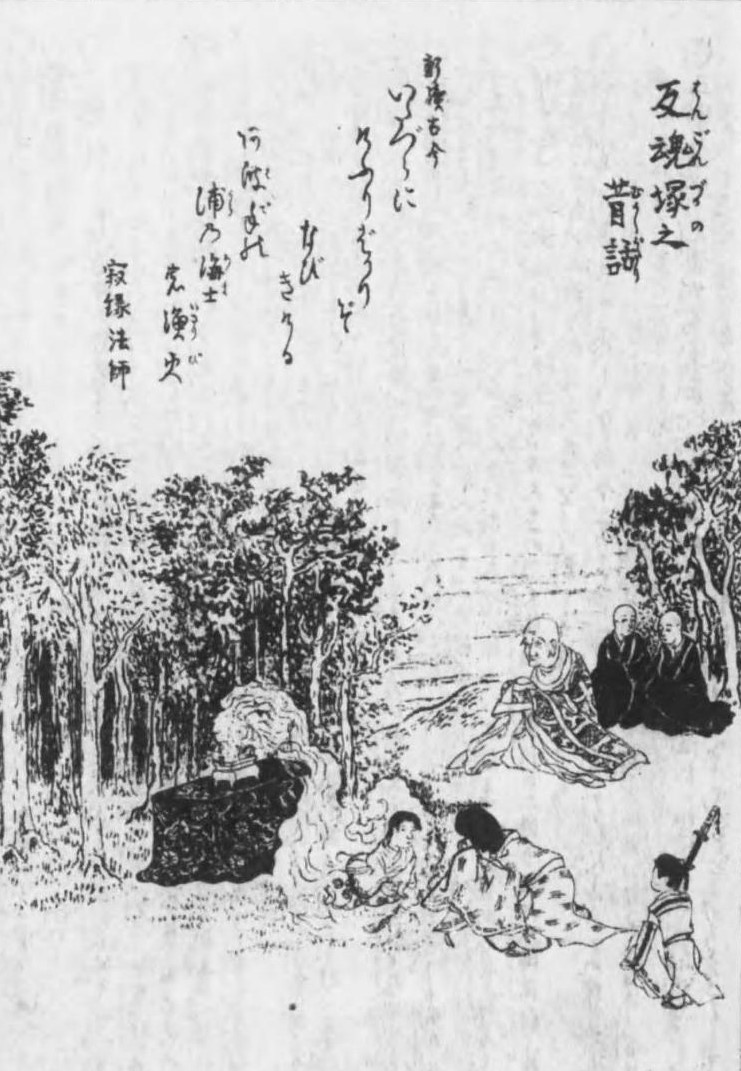 奥州信夫(福島の南部にあった村)の里から阿波手の森へと旅をしていた若夫婦がいたが、途中、妻が病で亡くなってしまう。悲しんだ夫は出家し、妻の塚の近くに庵をつくり、住むことにした。その後、話を聞いた和尚が反魂香を焚いたところ、煙のなかに若い女の姿が表れた。近づいて声をかけようとすると、煙とともに消えてしまったという。