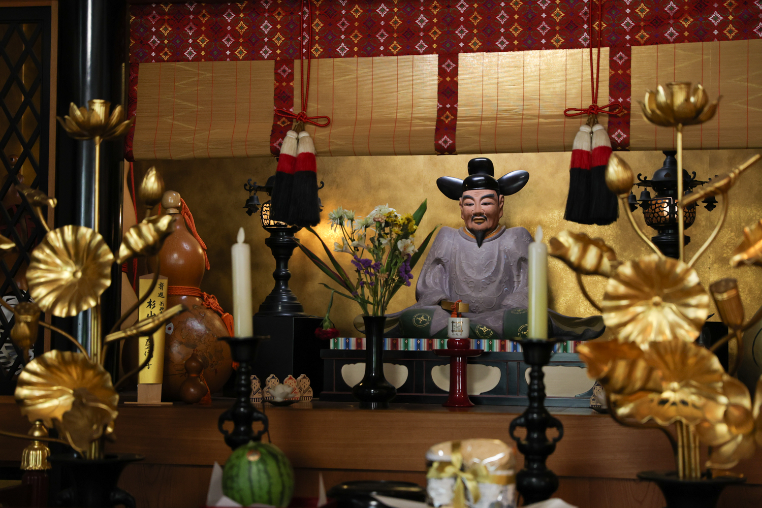 常泉寺には秀吉の御神体が祀られています。これはかつての大坂城にあったものですが、加藤清正が願い出て、豊臣秀頼から譲り受けたものなんだそうです。実はこの御神体は、40年ほど前に修復されています。というのも、ここ常泉寺が放火被害に遭って建物が全焼してしまい、その際に御神体も半焼状態までダメージを受けてしまったのです。この痛ましい事件に、僕も憤りを感じるばかりでしたが、それにまつわる興味深い話も聞けました。