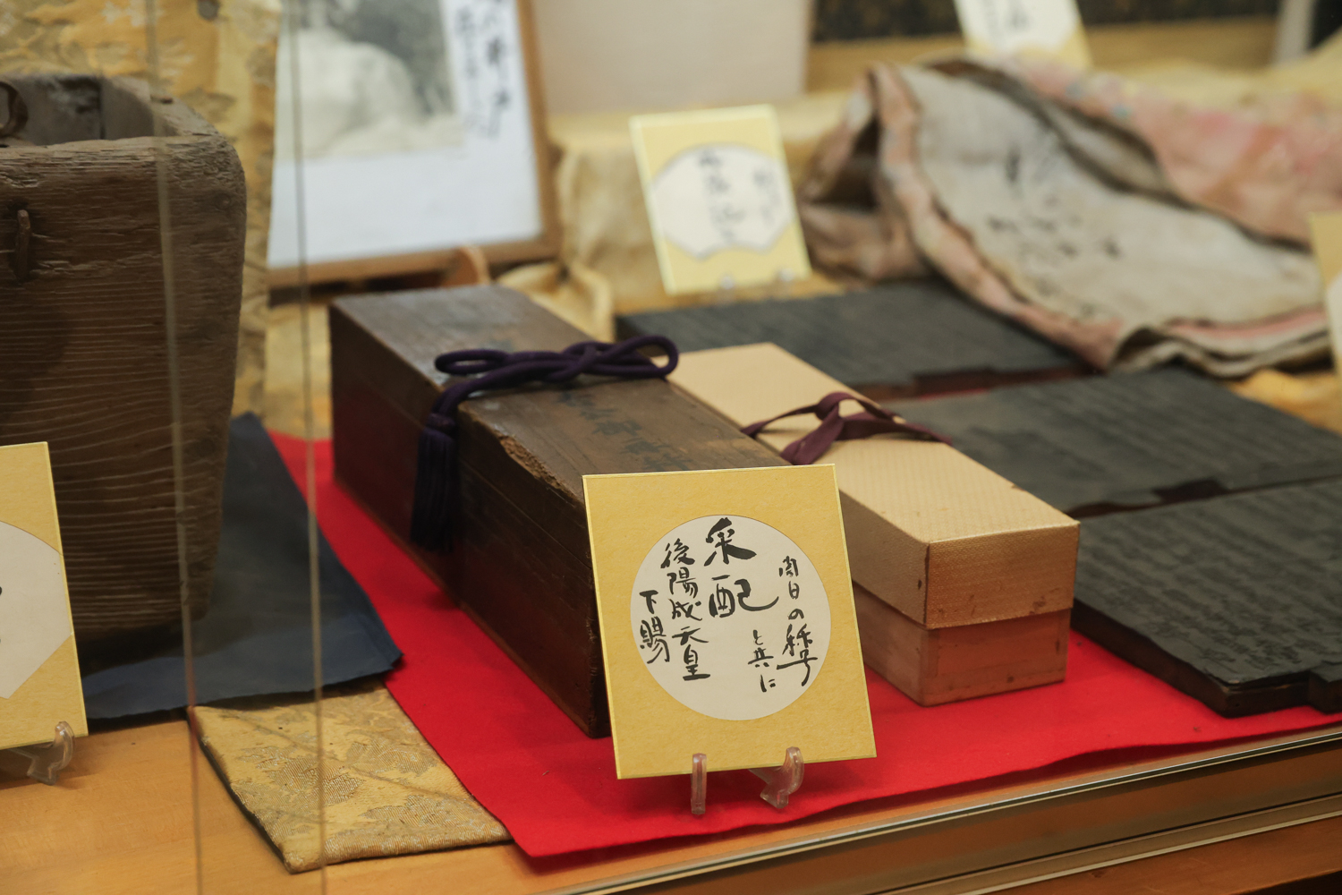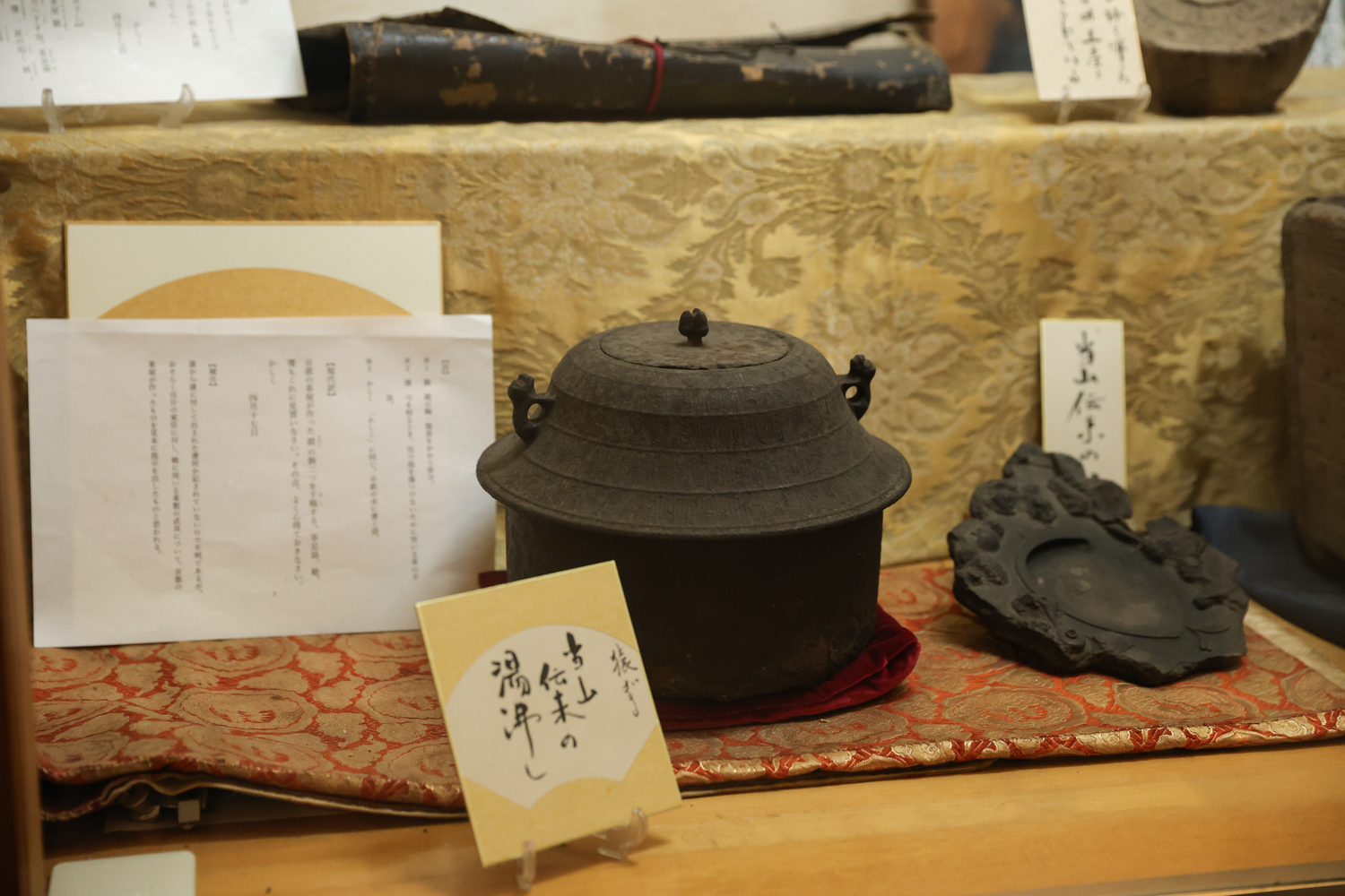 他にも、硯と共に保管されていたという茶釜や、井戸で使われていた釣瓶(つるべ)、当時の天皇から賜ったという采配(さいはい)など盛り沢山。歴史の深さに思わず息を呑んでしまいました。更には寺の歴史を紐解く文献や、寺の由来が刻まれた版木(はんぎ)、御神体と共に運ばれたと思われる秀頼の書や加藤清正の画像といったものなどなど……。じっくり見ていたら日がくれてしまいそうなほどのラインナップ。