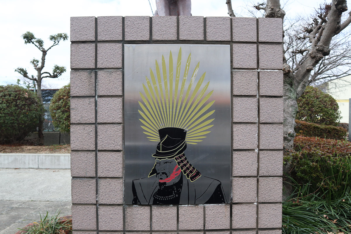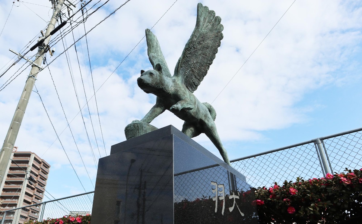 例えば、宗岳寺の50メートルほど先にある羽犬塚小学校。その校門前の「羽犬像」は、躍動感が半端ない。赤銅色の像で、前につんのめっているような体勢でポージング。羽は大きめで鋭い感じである。全体的にペガサスの犬版というイメージだ。非常に聡明な顔つきである。