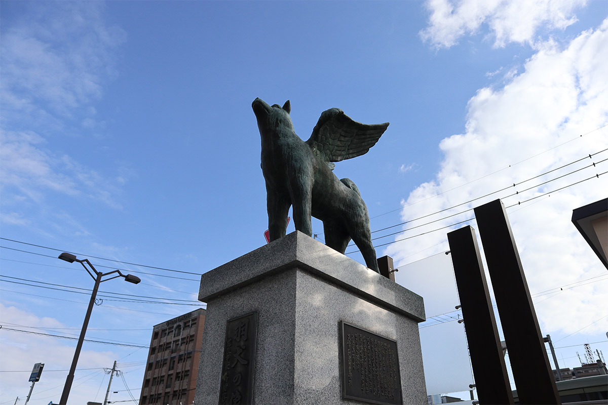 冒頭でご紹介した山の井交差点にある「羽犬像」は、純真無垢な可愛らしい顔つきだった。聡明というよりは気弱で優しげという感じ。羽もふさふさで、そのボリューミー感は鷹などの猛禽類を思わせる。もう少し控えめに羽が生えているかと思ったが。羽の存在感がこれまたスゴイ。コチラも独特の「羽犬像」である。