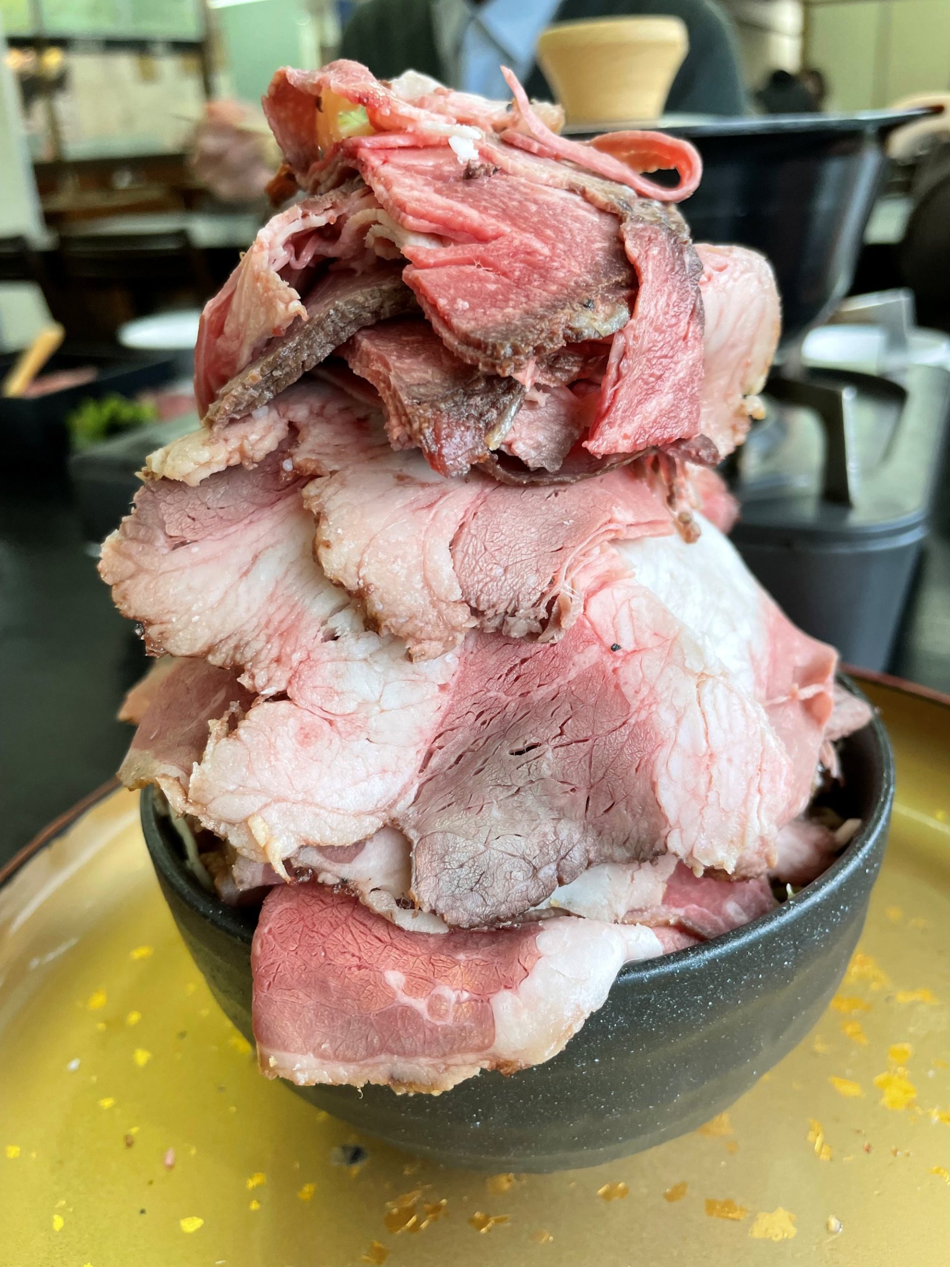 また、店員さんが永遠にローストビーフを重ねてくれる肉丼も。びっくりするほどお得な値段、2200円!