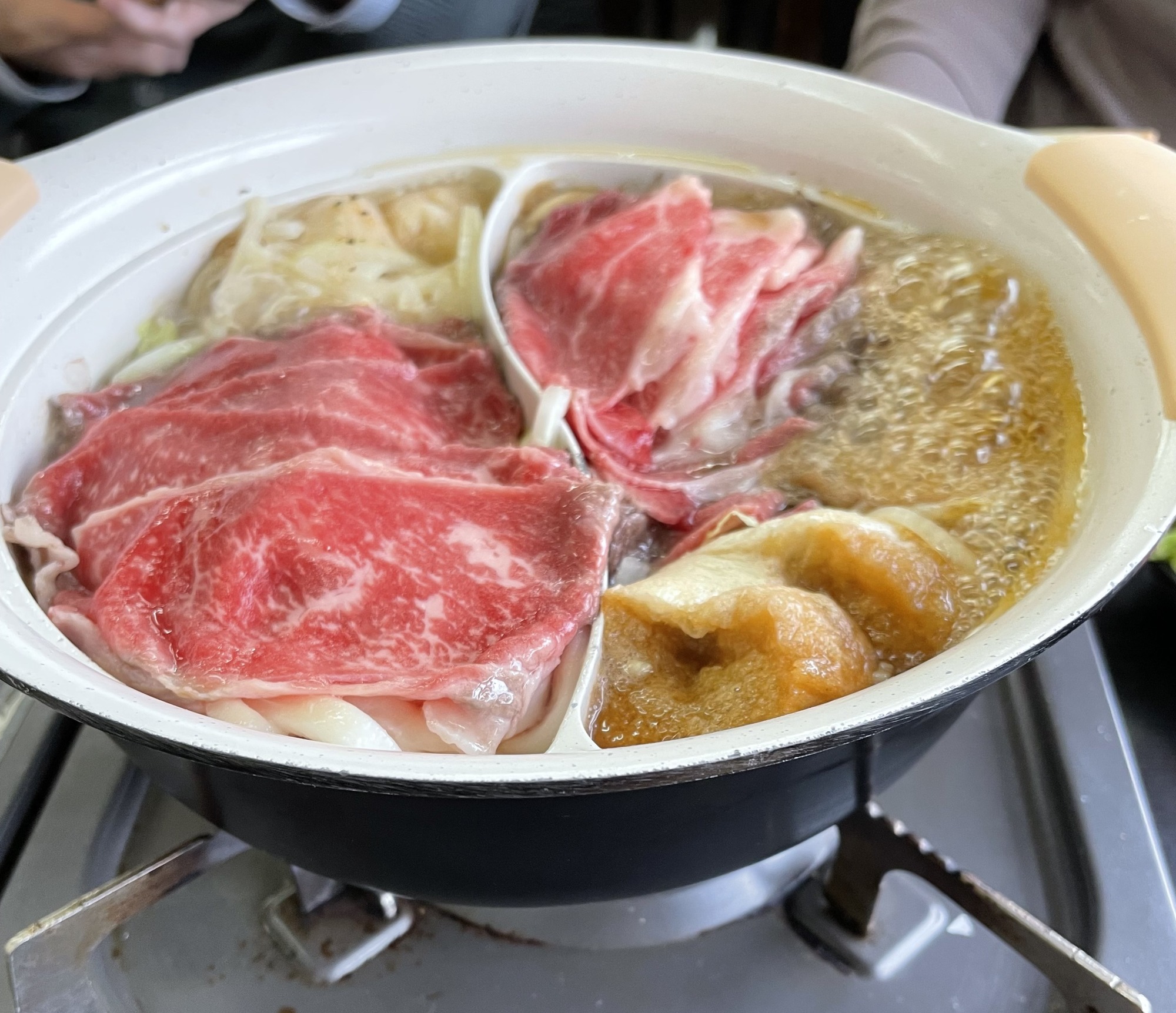 こちらの「関ヶ原合戦すき焼き」が、おすすめ。地元の飛騨牛と近江牛の食べ比べができる。しかも飛騨牛のほうの割り下は、牛骨スープで塩気がある珍しいレシピ。これがまた、まるでラーメンのスープのようにコクがあっておいしい!