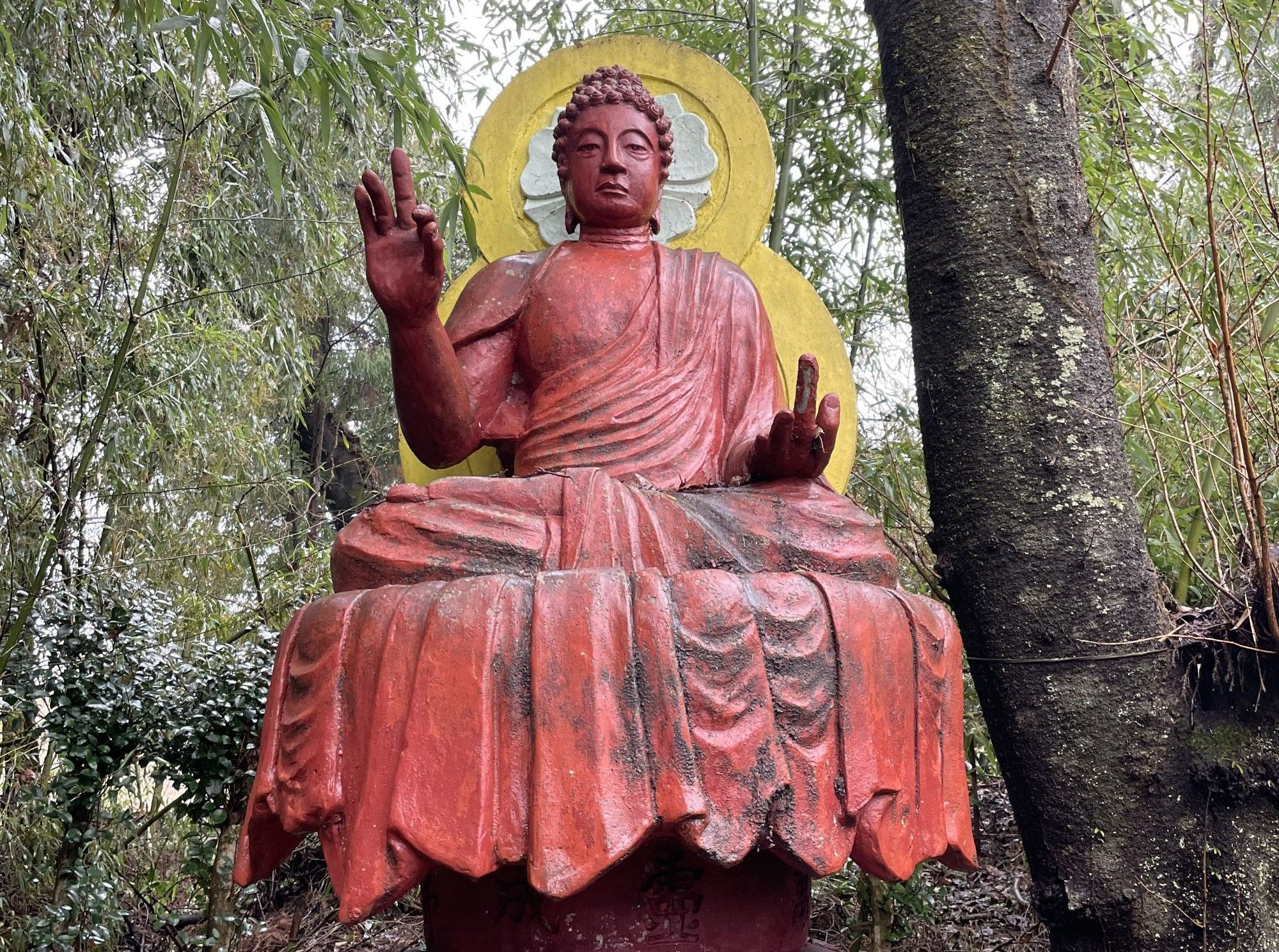 血肉の争いをしているコンクリート人形群のなかに突如現れる薬師如来。まるで、出世争いに疲れた会社員の中年男性……のような顔立ちが味わい深い。