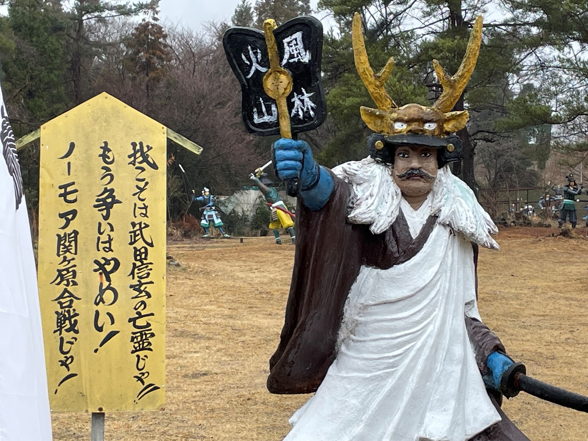 関ヶ原ウォーランドファンの間で有名なのは、入場するとすぐ出迎えてくれる武田信玄だ。「信玄は、関ヶ原の戦いには参戦してないぞ」とツッコミを入れたい読者もいるかもしれないが、このキャプションを見てほしい。