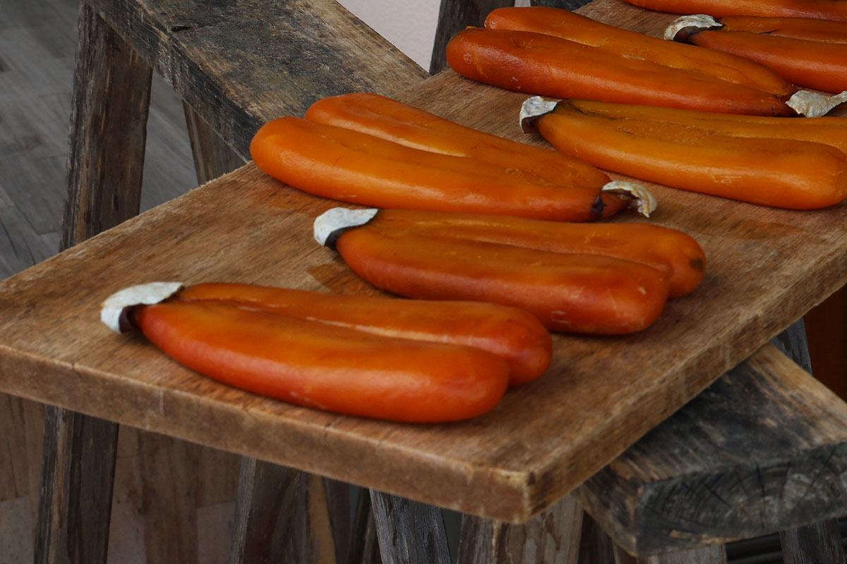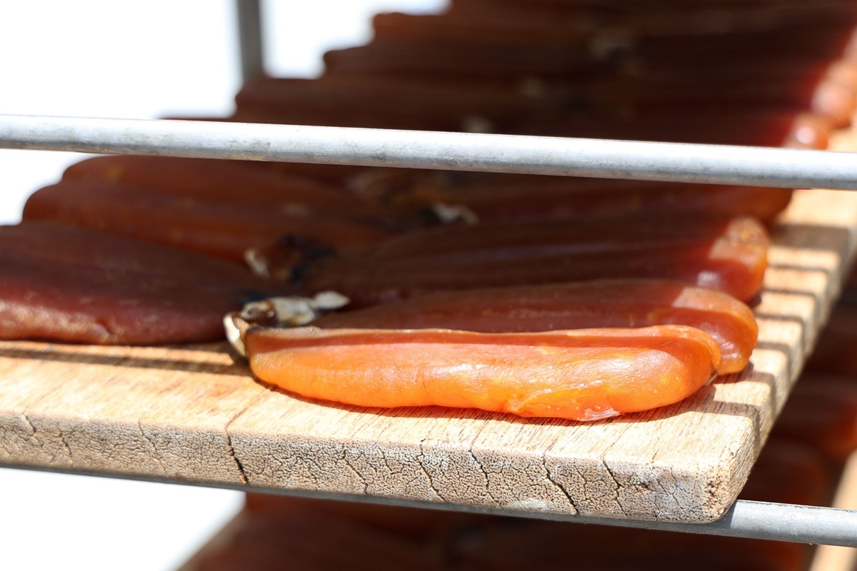 天日干しを含め約1ヵ月の期間を要する「からすみ」。