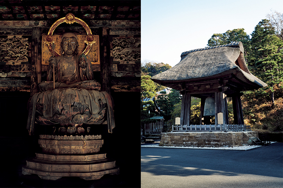左/「仏殿」に安置された本尊は、極楽浄土から地獄に至るまで、すべての生物を救い、成仏させると誓う「地蔵菩薩坐像」。座高約2・4m、台座まで含めると約5mもある、鎌倉屈指の巨大な木像。当初の像は度重なる罹災で失われ、現存の像は応永21(1414)年以降の再興と考えられる。