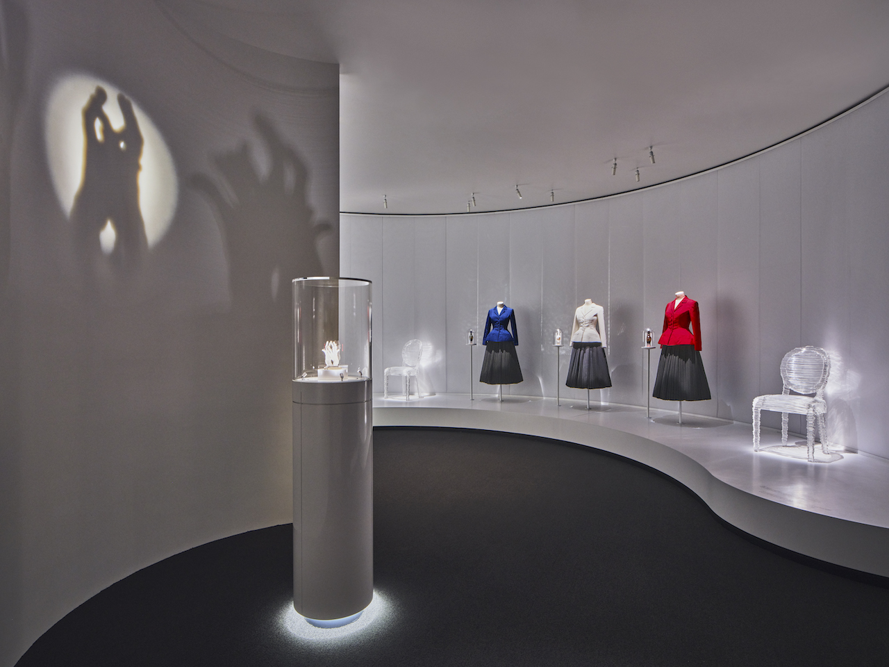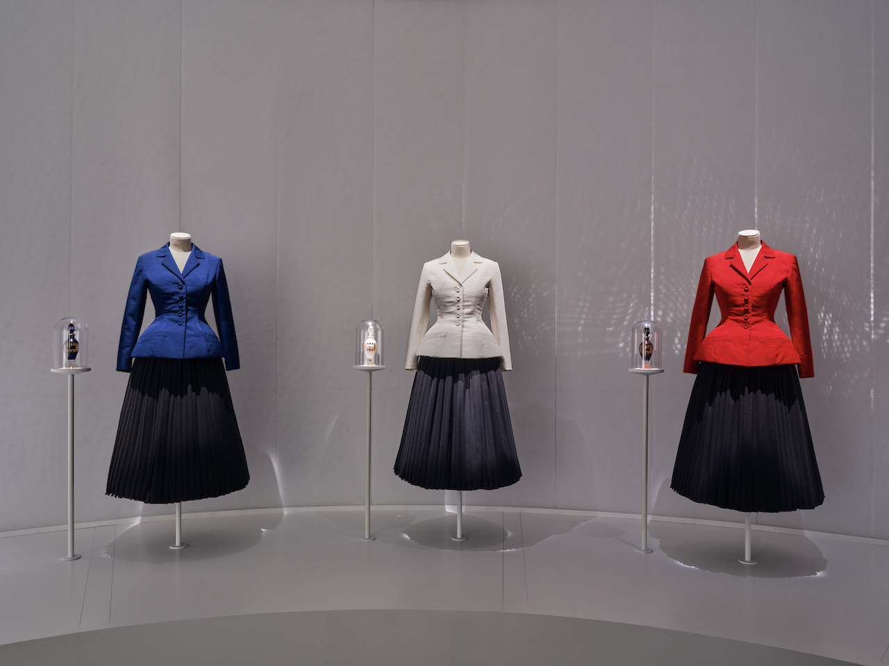 一方でディオールは、職人技と手仕事へのオマージュとして、ロダンの彫刻、ブルー、ホワイト、レッドの3つのバリエーションでディオールのエレガンスを象徴した、タイムレスな「バー」スーツを展示。