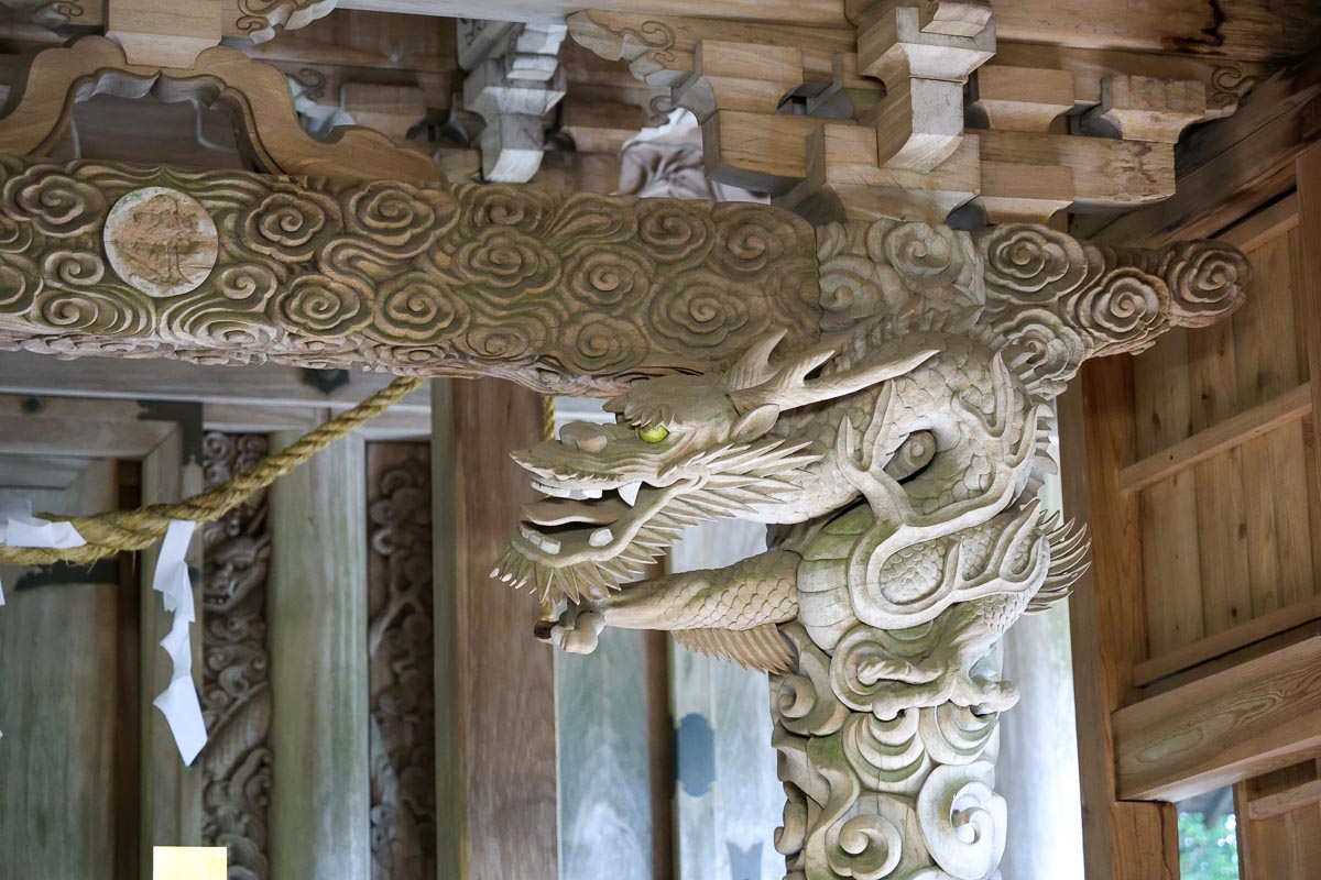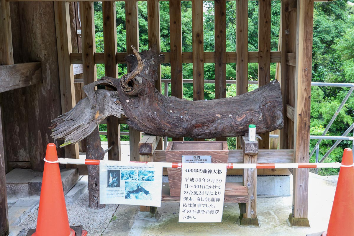 「倒れたんですよ。台風で。(樹齢)400年ぐらいの大杉が。そのまま裏参道に全部倒れまして。その龍神様のお姿に似た部分だけは上を向いて壊れてなかったので。御神殿の神門横にお飾りしてるんですけど」