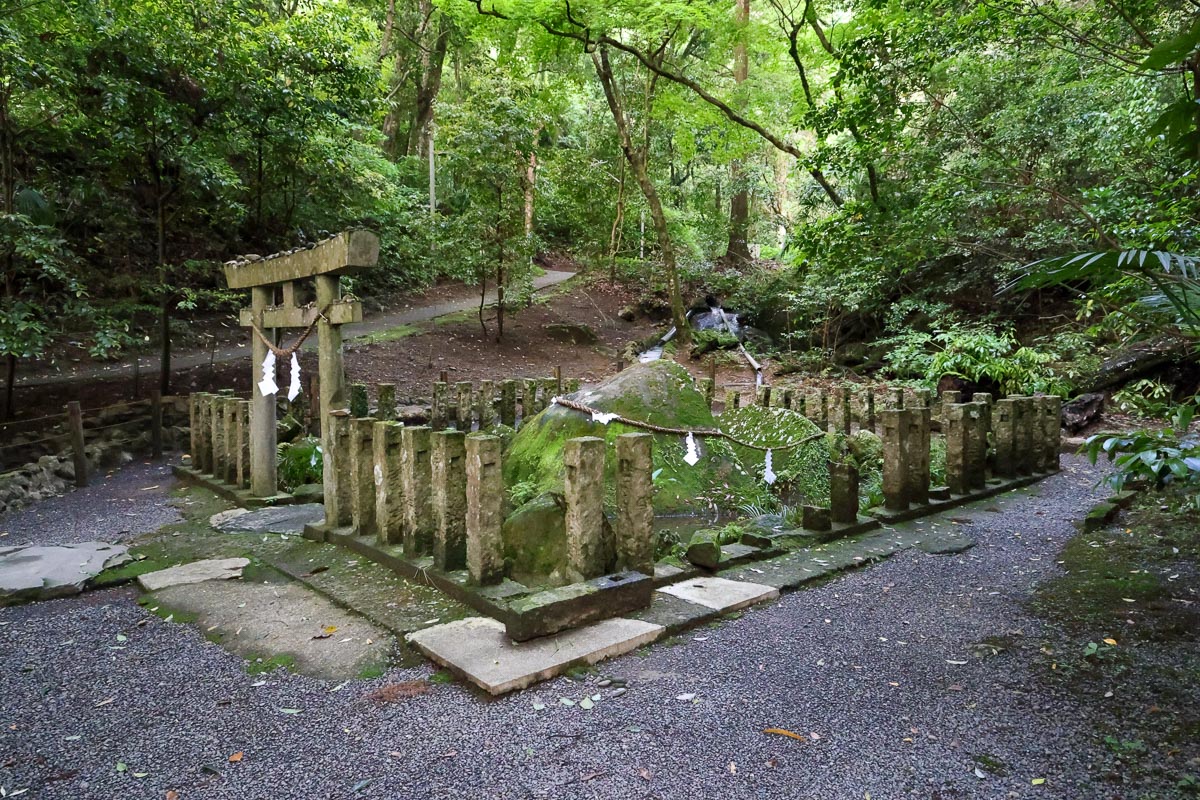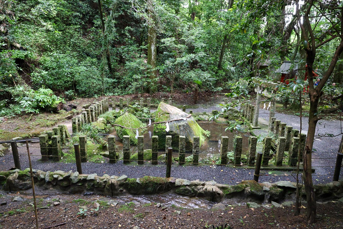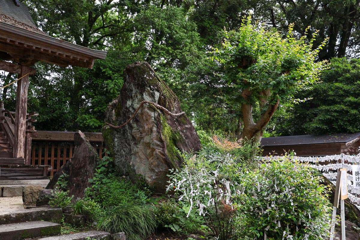 「御神殿の上にある岩……というか石ですね。あちらがこの神社の元、始まりと言われています。御神殿が建つ前に、こちらの石を神様として古来より信仰してきたんです」