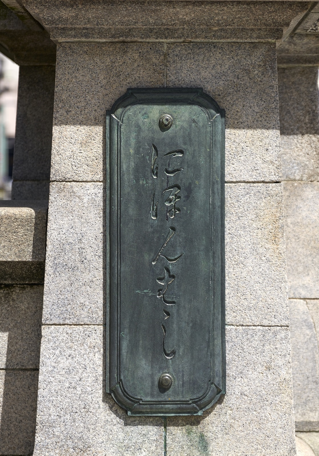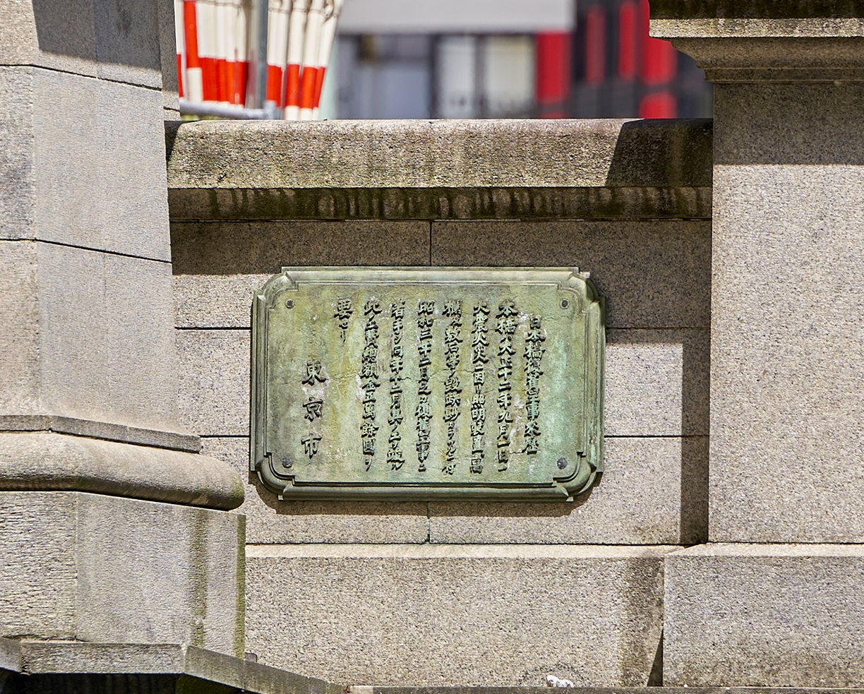 日本橋の橋台にひっそり取り付けられたプレートには、橋の建設に関わった設計者や関係者の名前が記されている。かつてはこうしていたが、震災復興以降、分業化もあって、橋の建設には多くの人が関わるようになり、名前入りのプレート設置は禁止となった。