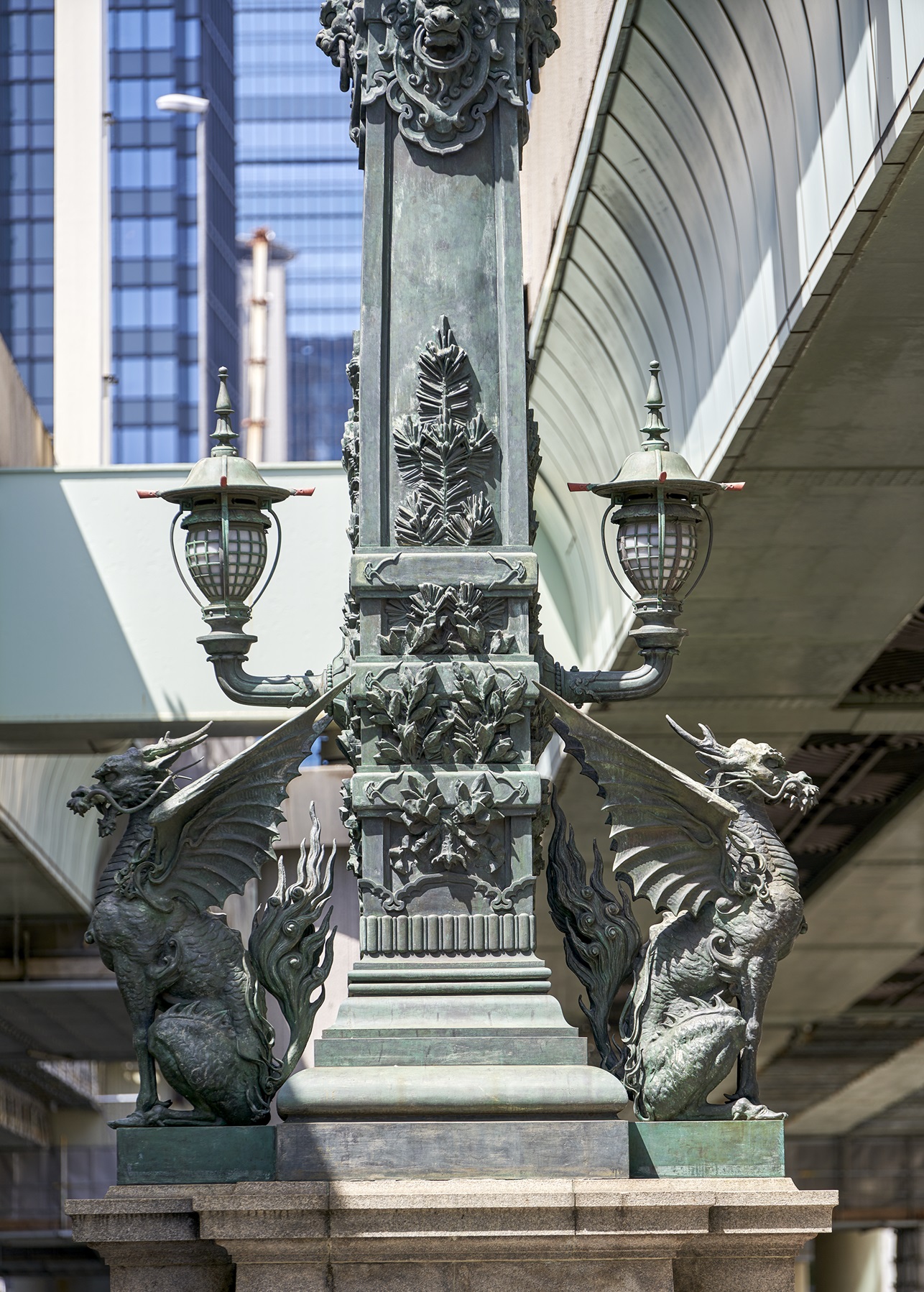 東野圭吾の小説『麒麟(きりん)の翼』でおなじみ、橋中央に鎮座する麒麟像。中国の伝説上の動物で、泰平(たいへい)の世に現れるとされ、東京の繁栄を祝福する意味がある。よく見ると阿吽(あうん)の対になっていて、2体が背中合わせに橋を守っている。翼のような背びれは、五街道の起点ゆえ、翔ける=〝旅立ち〟をイメージしているとか。