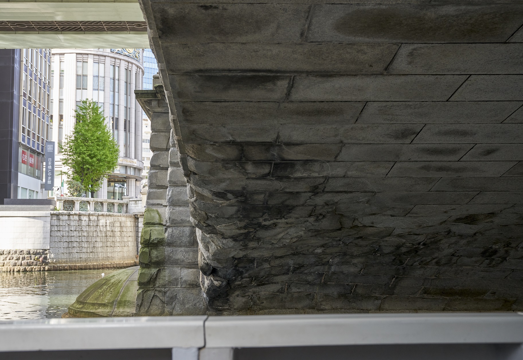 現在の日本橋は、外部は石造だが、内部はレンガとコンクリート造り。そのため、関東大震災では木造の橋のような火災の被害を受けることはなかった。しかし、焼けた船が橋下を通った際、アーチ裏側の石に接触しケロイド状に変形。火災の凄さを物語っている。