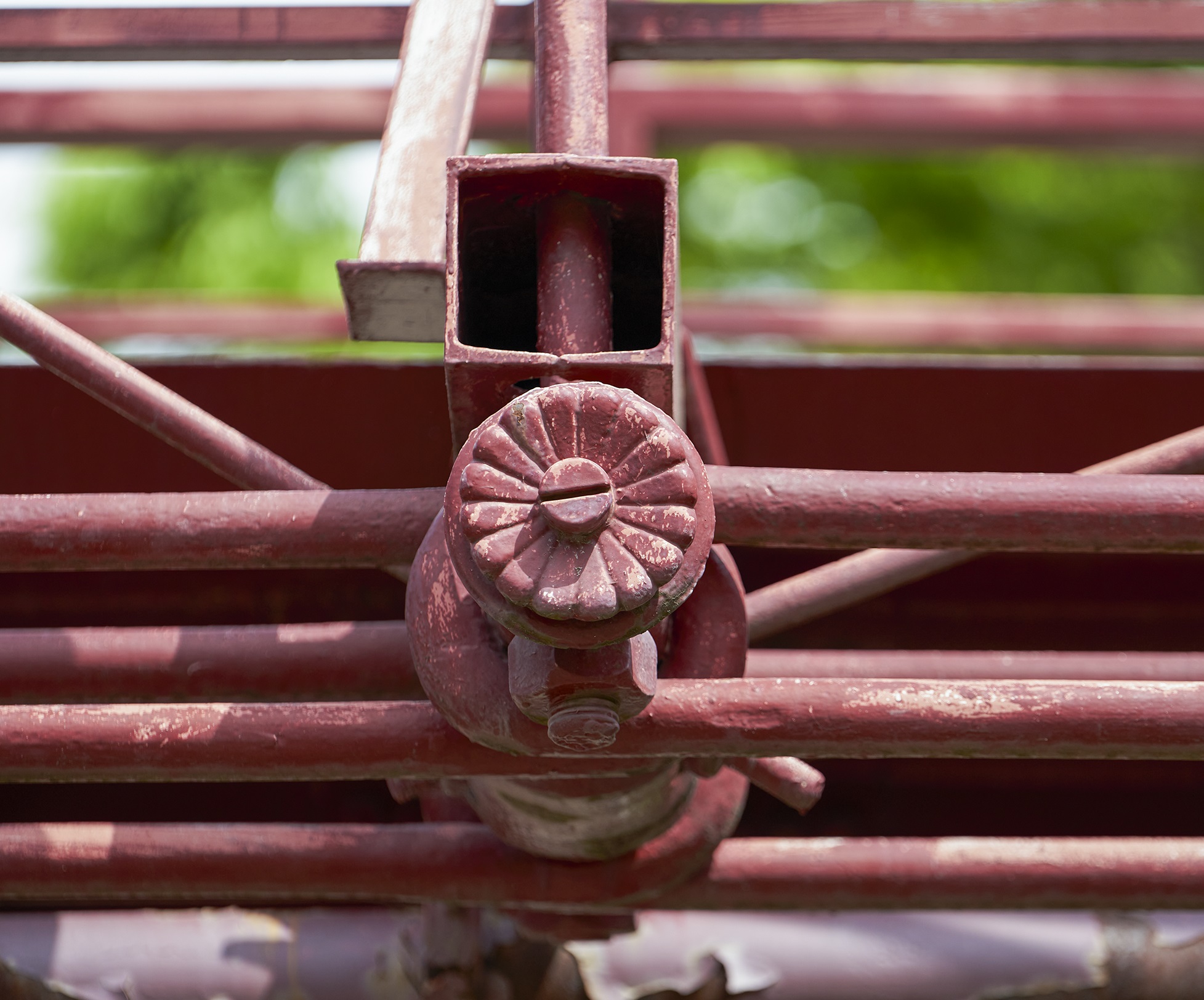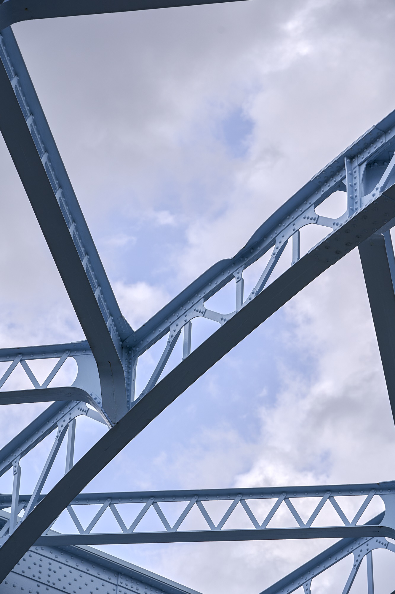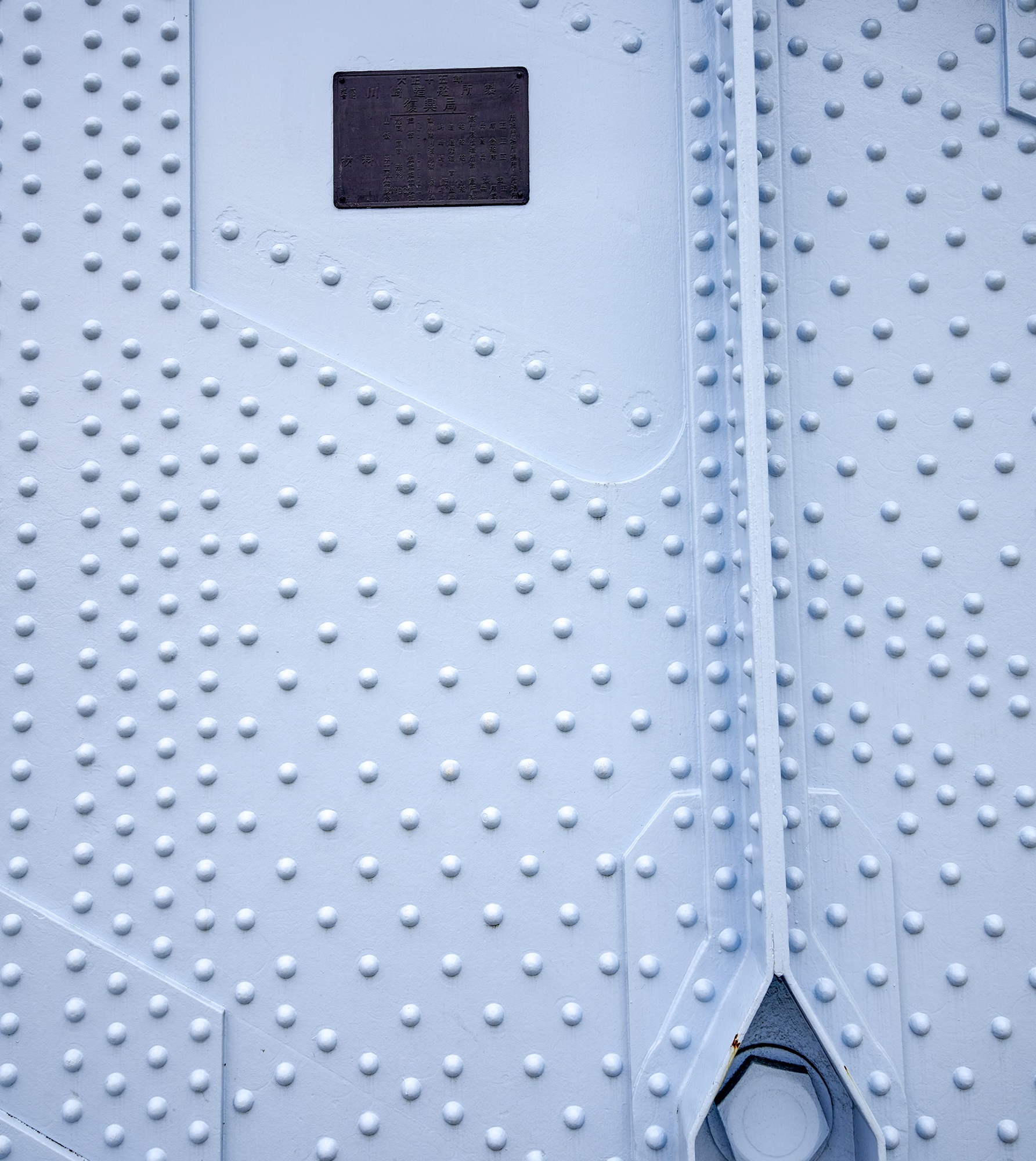 永代橋の無骨さ、マッチョさを際立たせているものとして、丸い頭のリベット(鋲=びょう)が生み出す陰影があげられる。薄い鋼板を何枚も重ね、穴をあけて熱い鉄を流し込んで留めるリベットは、手間暇かかるが、当時のその技術は、まさに芸術。さらに、溶接と違って、疲労亀裂がなく、最強の技術といえる。