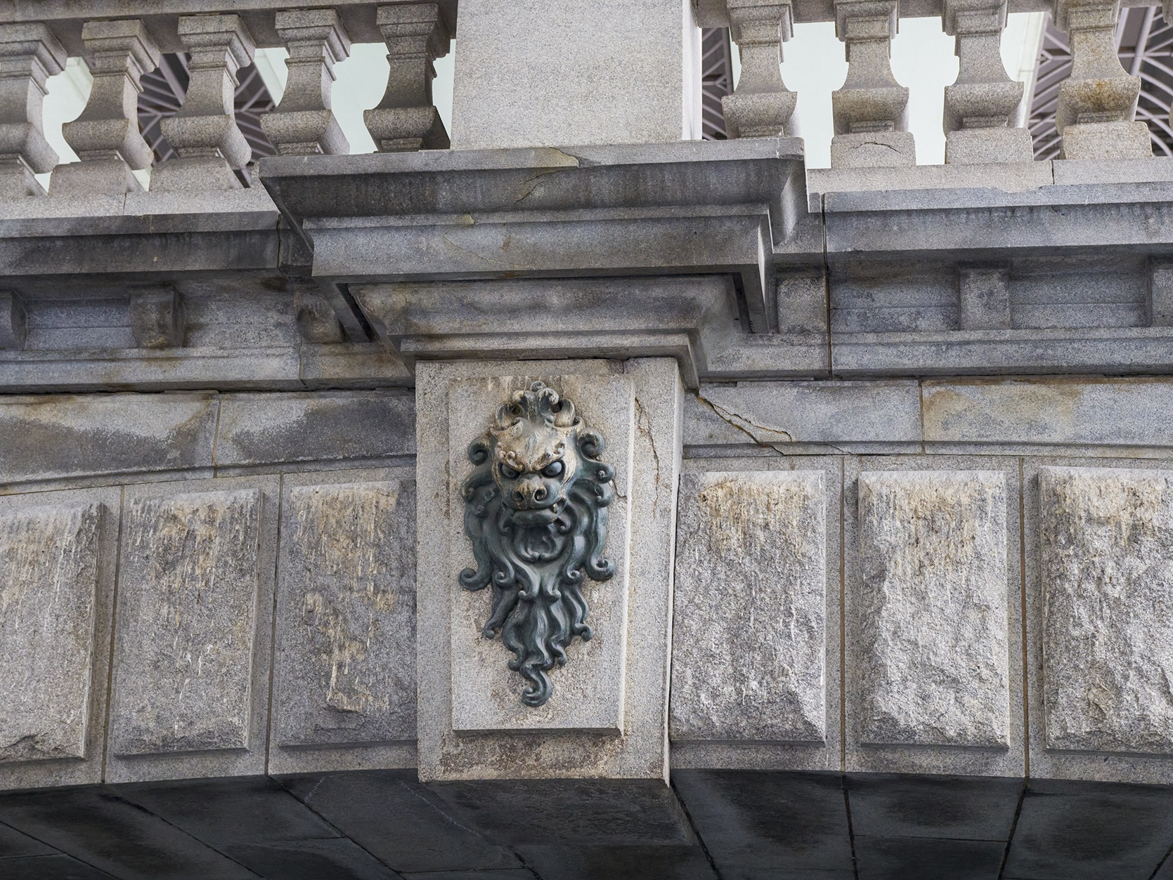 正解は32頭。親柱(おやばしら)に東京市の紋章を抱えた4頭、親柱と中央、計6つの橋灯の東西南北に4頭、橋上からは見えない二連アーチ部分(写真)に4頭。橋(8×4)にちなんでいるとか。モデルは、奈良の手向山八幡宮(たむけやまはちまんぐう)や薬師寺(やくしじ)の狛犬(こまいぬ)で、百獣の王として東京市を守っている。