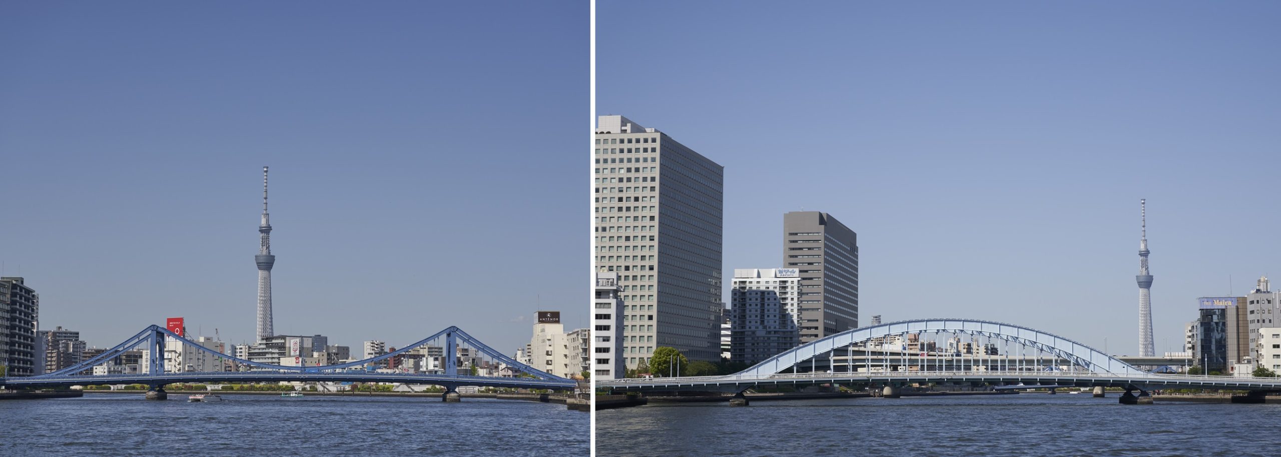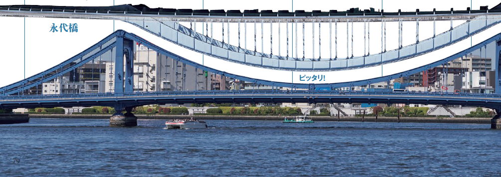架橋された当時、永代橋と清洲橋は隣り合っており(現在は間に隅田川大橋がある)、重厚なフォルムの永代橋は男性的、優美なラインの清洲橋は女性的と、ペアの橋として計画された。そのせいか、下のように永代橋をくるりとひっくり返して清洲橋に近づけてみると…、そのアーチは見事に一致! なんと大胆! 設計者の遊び心(!?)に脱帽!
