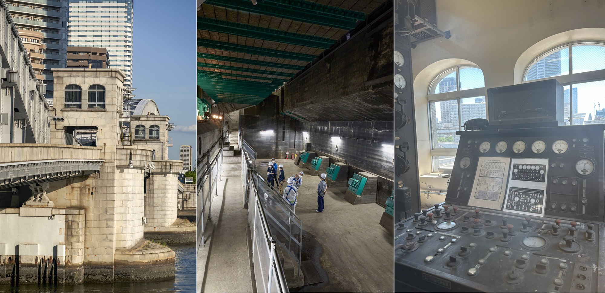 勝鬨橋の真ん中の橋上に立つ4つの建屋、気になりません? 開橋していた当時は、それぞれ運転室、見張り室、倉庫、宿直室でしたが、なんと、その運転室や橋脚内部の機械室などをプロの解説つきで見学できるツアーがあるのですが、令和7年9月より塗装工事のため残念ながら休止中です。詳細は https://www.tmpc.or.jp/06_info/kachidoki.html