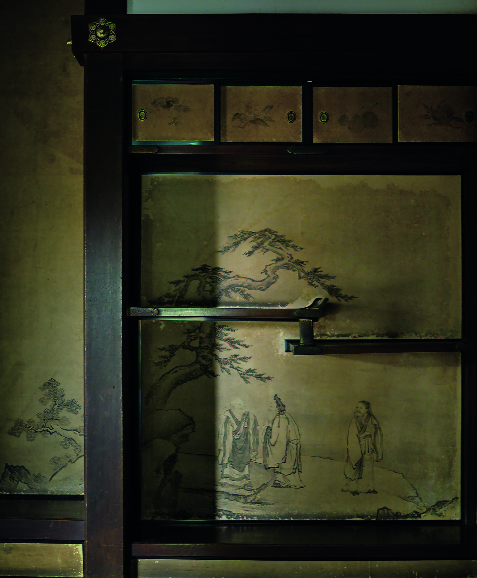 方丈「上間一の間」の水墨画。中国の東晋(とうしん)時代、廬山(ろざん)に隠棲(いんせい)していた高僧・慧遠(えおん)が、友人である陶淵明(とうえんめい)と陸修静(りくしゅうせい)を送る際、話に夢中になるあまり、俗世との境界である虎渓の橋を無意識に渡ってしまい、3人で大笑いしたという、中国の故事「虎渓三笑(こけいさんしょう)」が題材になっている。