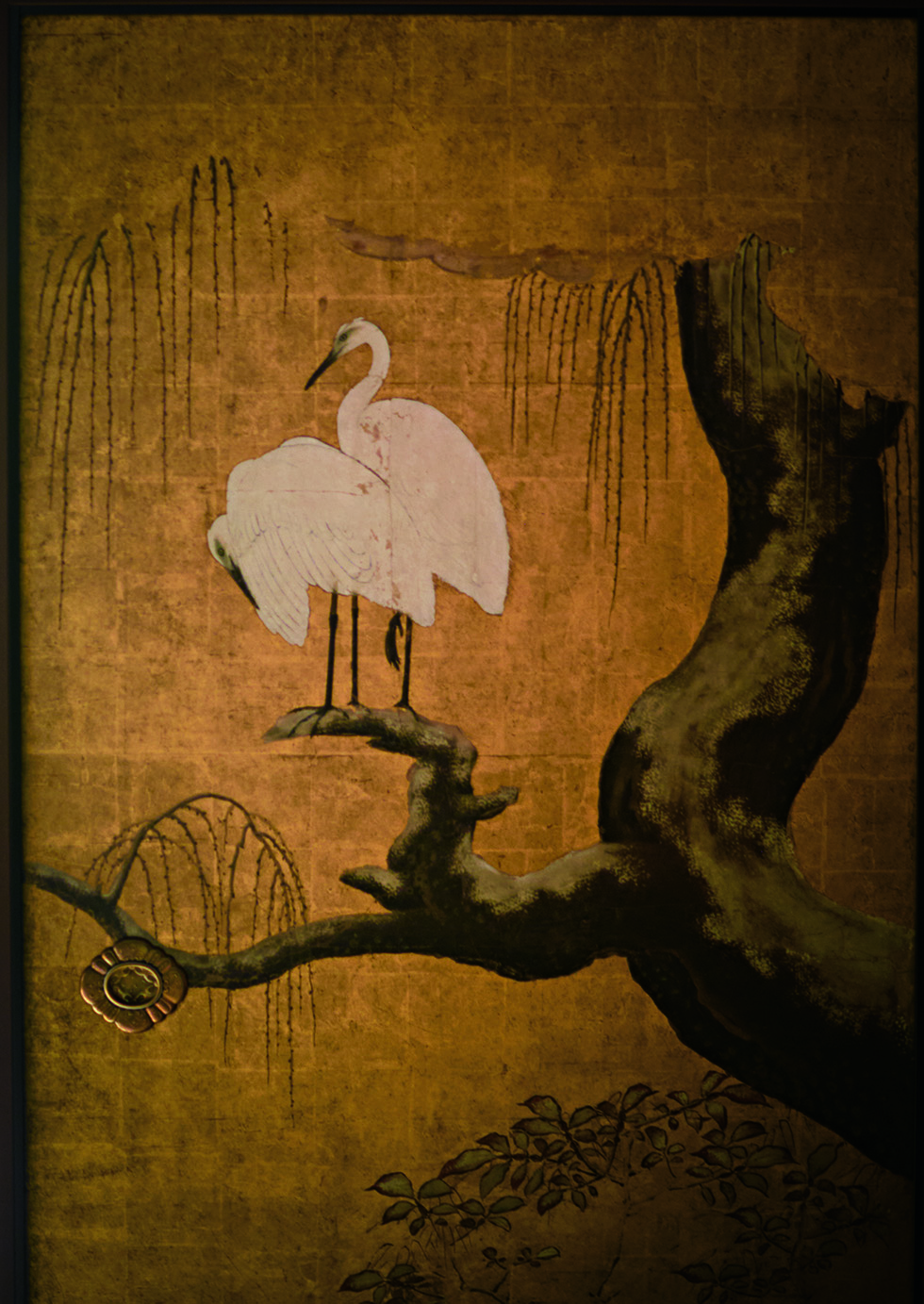 「上間二の間」の襖絵は18面で構成され、「梅・柳に遊禽図襖」と呼ばれる。春と冬、ふたつの季節が描かれ、この南面には柳と白鷺を主とする冬の景色が。狩野山楽・山雪筆。