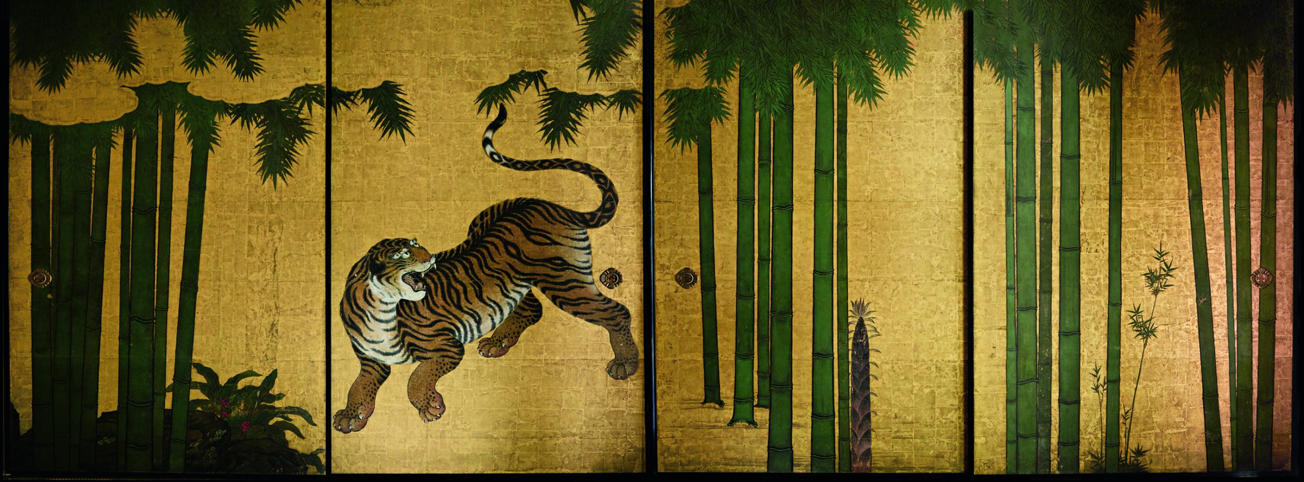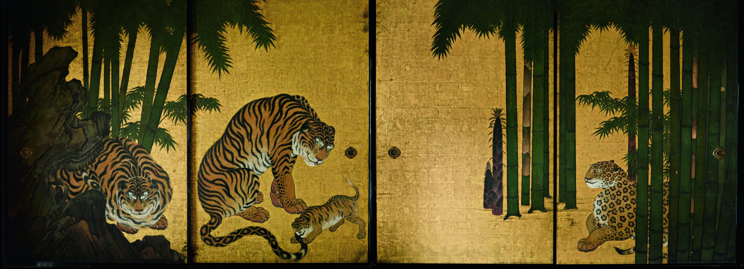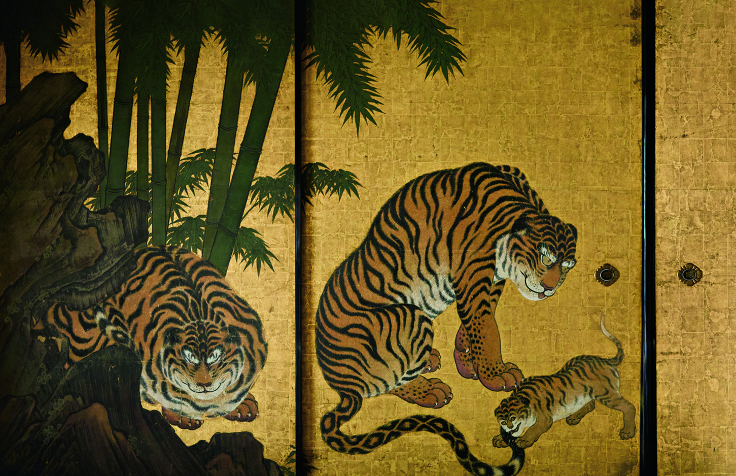 仏事が執り行われる「室中(しっちゅう)」20面に描かれた「竹に虎図」。東側には上方を見上げる虎、西側には子供の虎を自らの尻尾であやす虎の家族の風景が。狩野山楽・山雪筆。