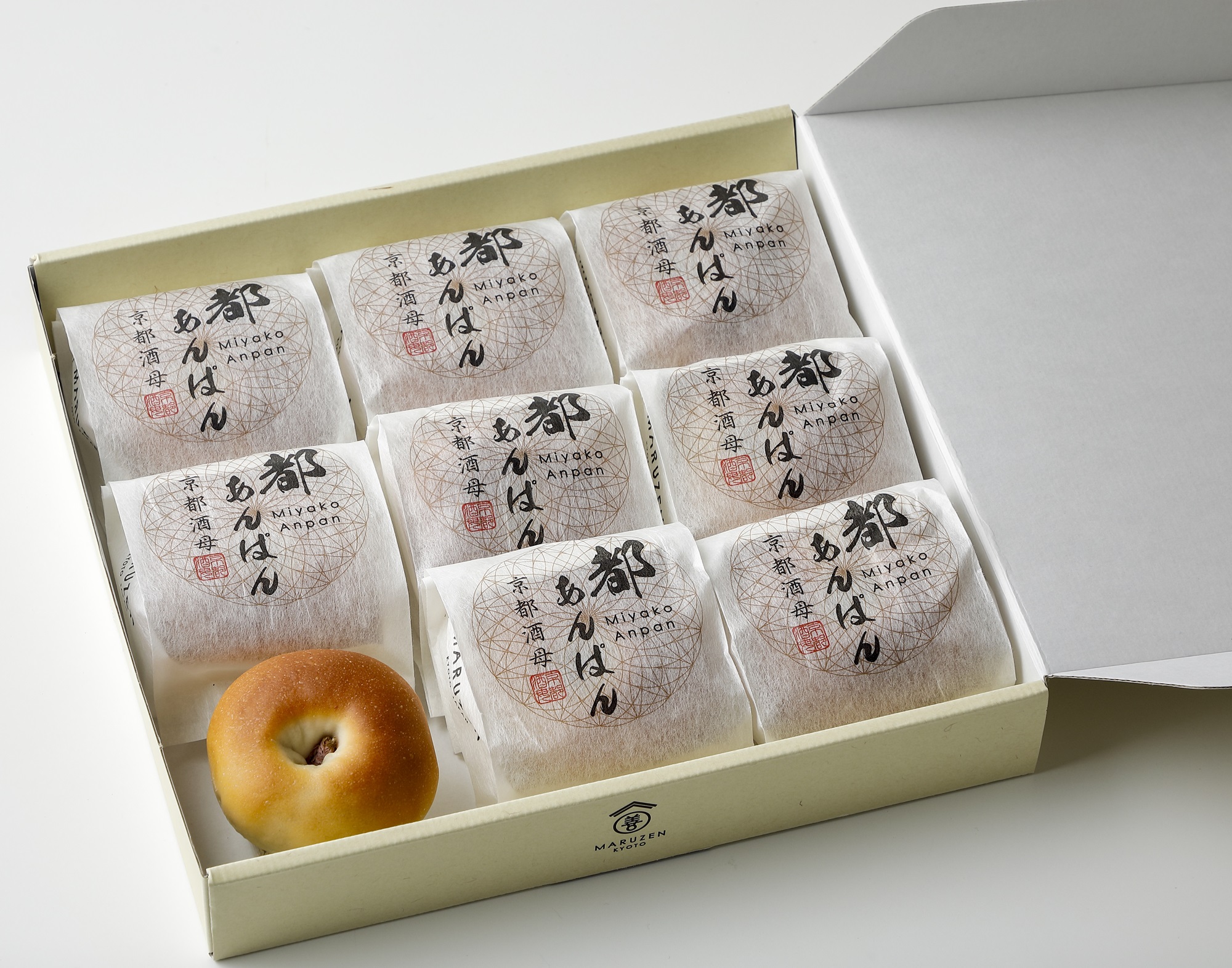 都あんぱん9個入り2,235円。自家製の甘酒と京都の銘酒による酒母(しゅぼ)を用いたパン生地に、北海道十勝産小豆による餡。酒種(さかだね)酵母の香りが立ちます。