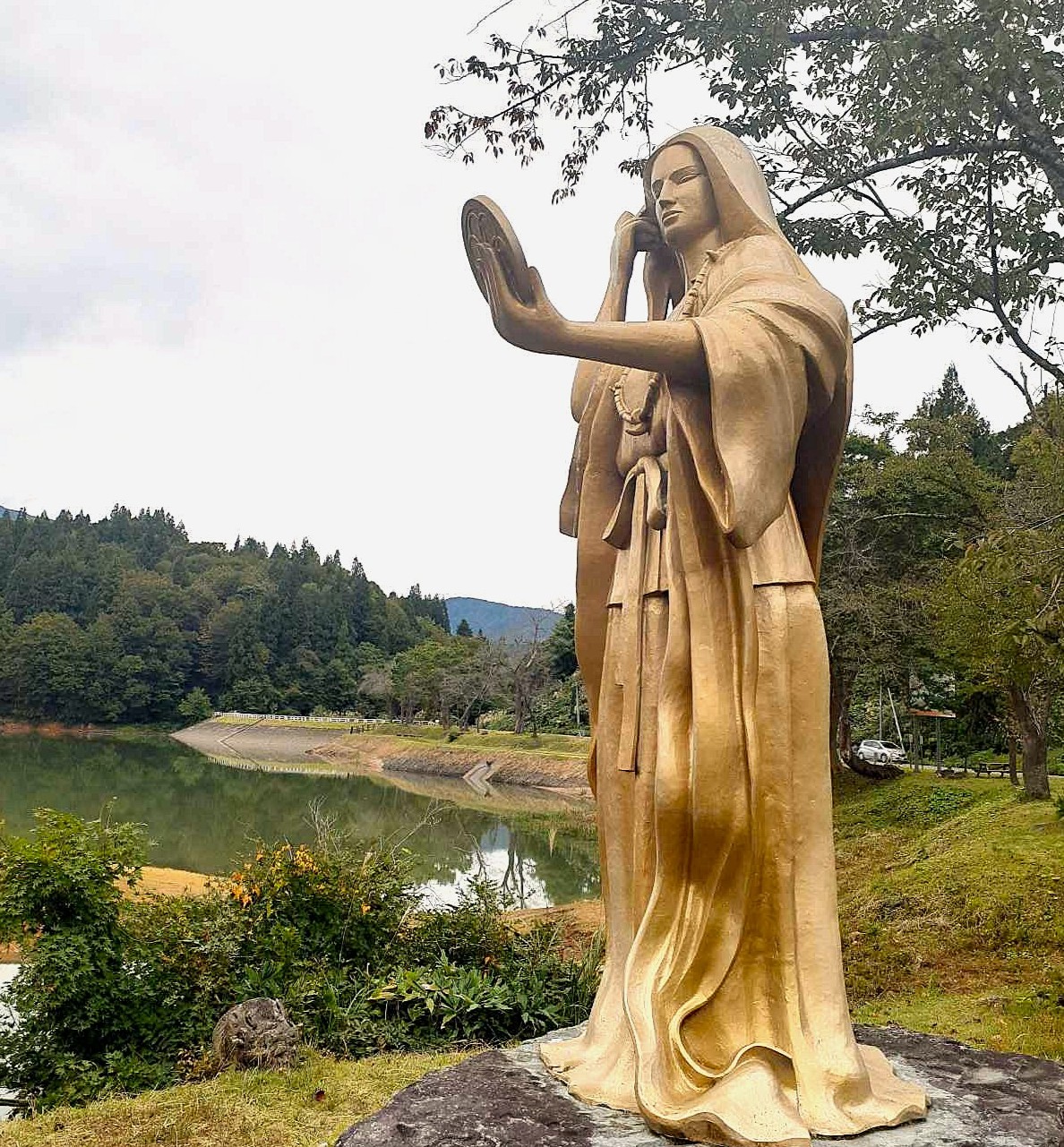 鏡ヶ池をお気に入りの鏡として使っていたという伝説の女神をモチーフにした像。池に石を投げこんだり、水を汚したりすると女神様のお怒りに触れるそうなので、お気を付けて