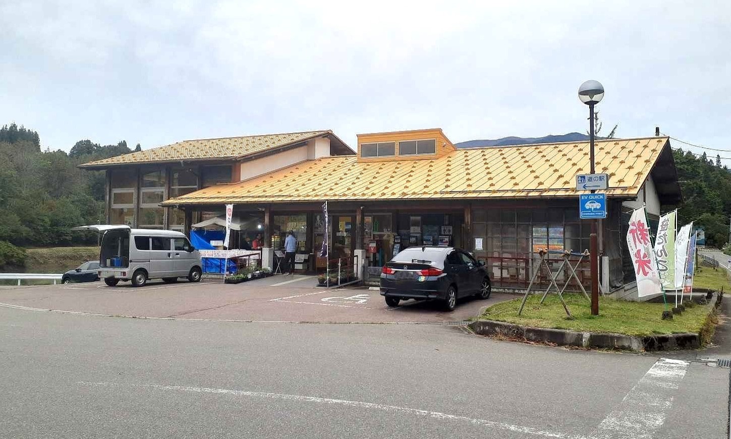 「道の駅 いりひろせ」外観。入口付近ではニジマスの塩焼きなども販売していました。2025年10月22日取材