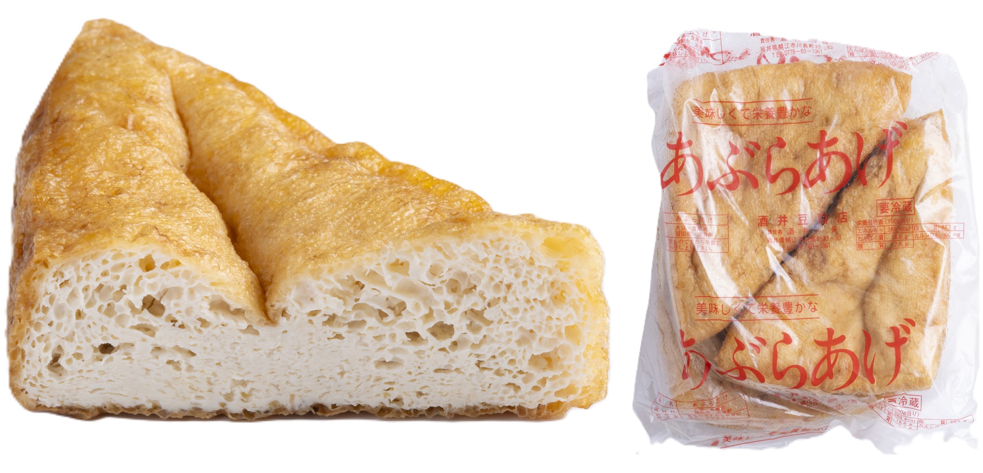 福井の油揚げは、大まかに「厚揚げ」「薄揚げ」(他府県でいう油揚げ)の2種類に分かれます。