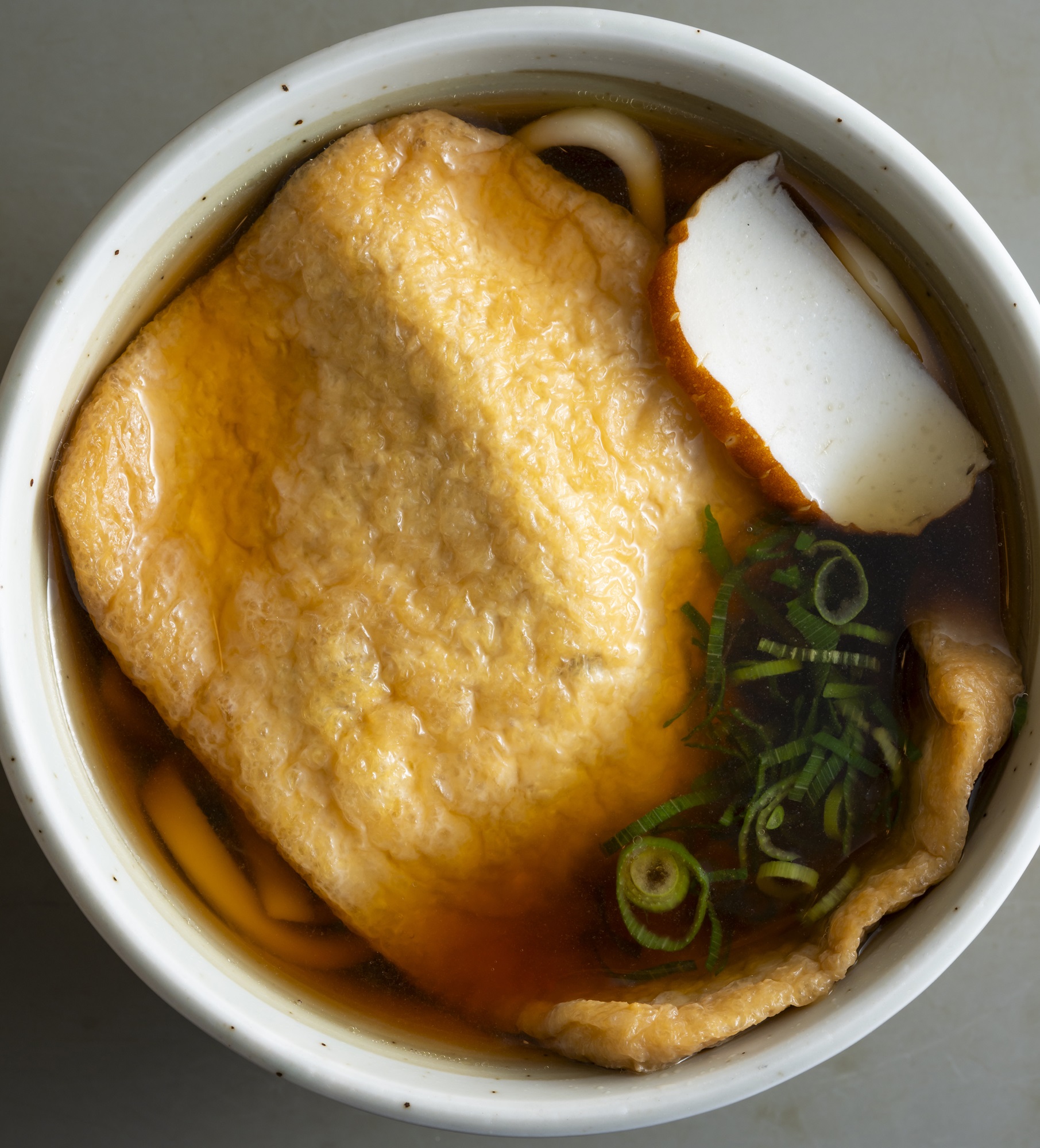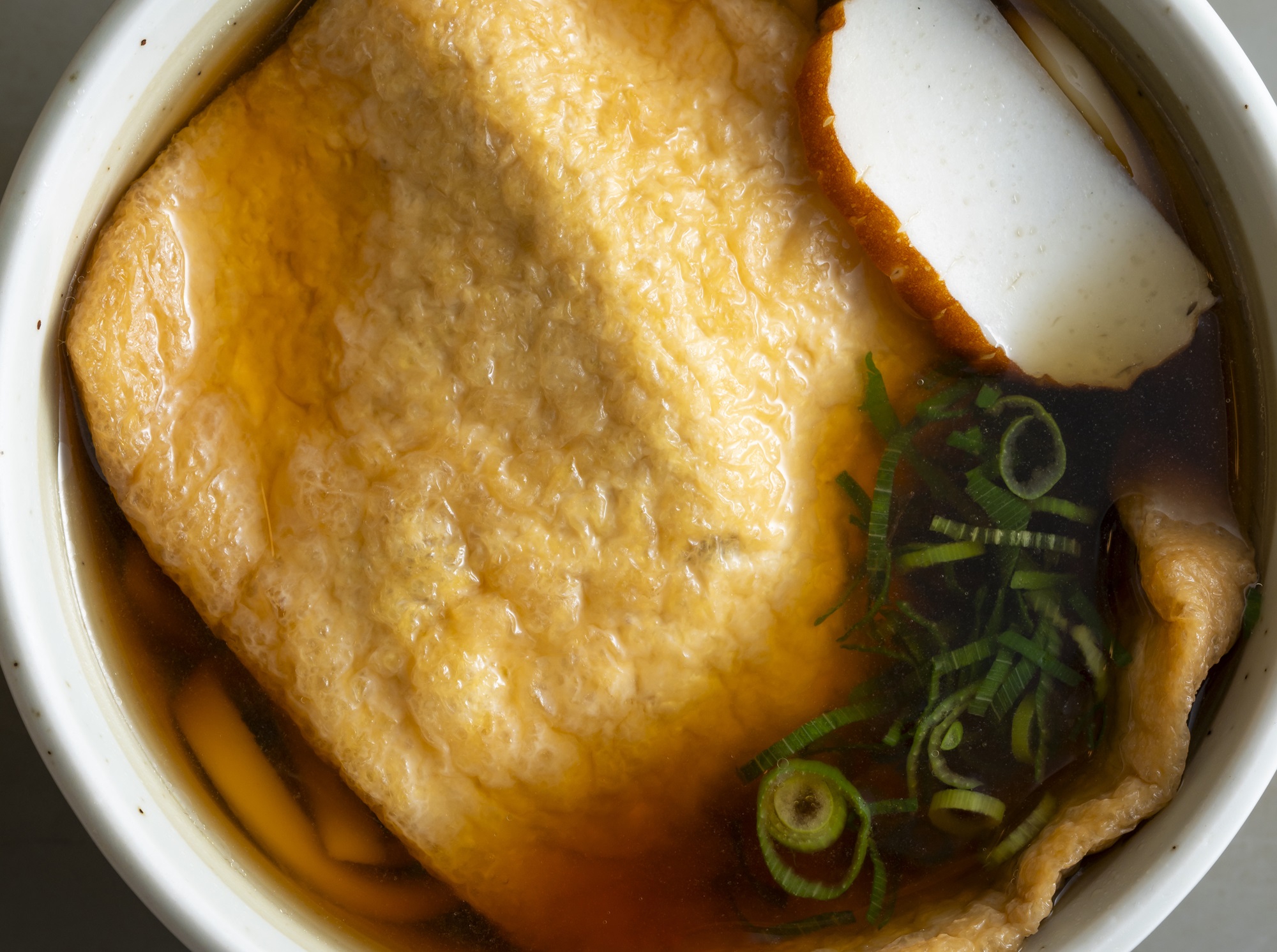 油揚げを引き立てるのは、利尻(りしり)昆布に鰹本枯節(かつおほんかれぶし)、鯖(さば)節など質にこだわった出汁と、自家製麺。