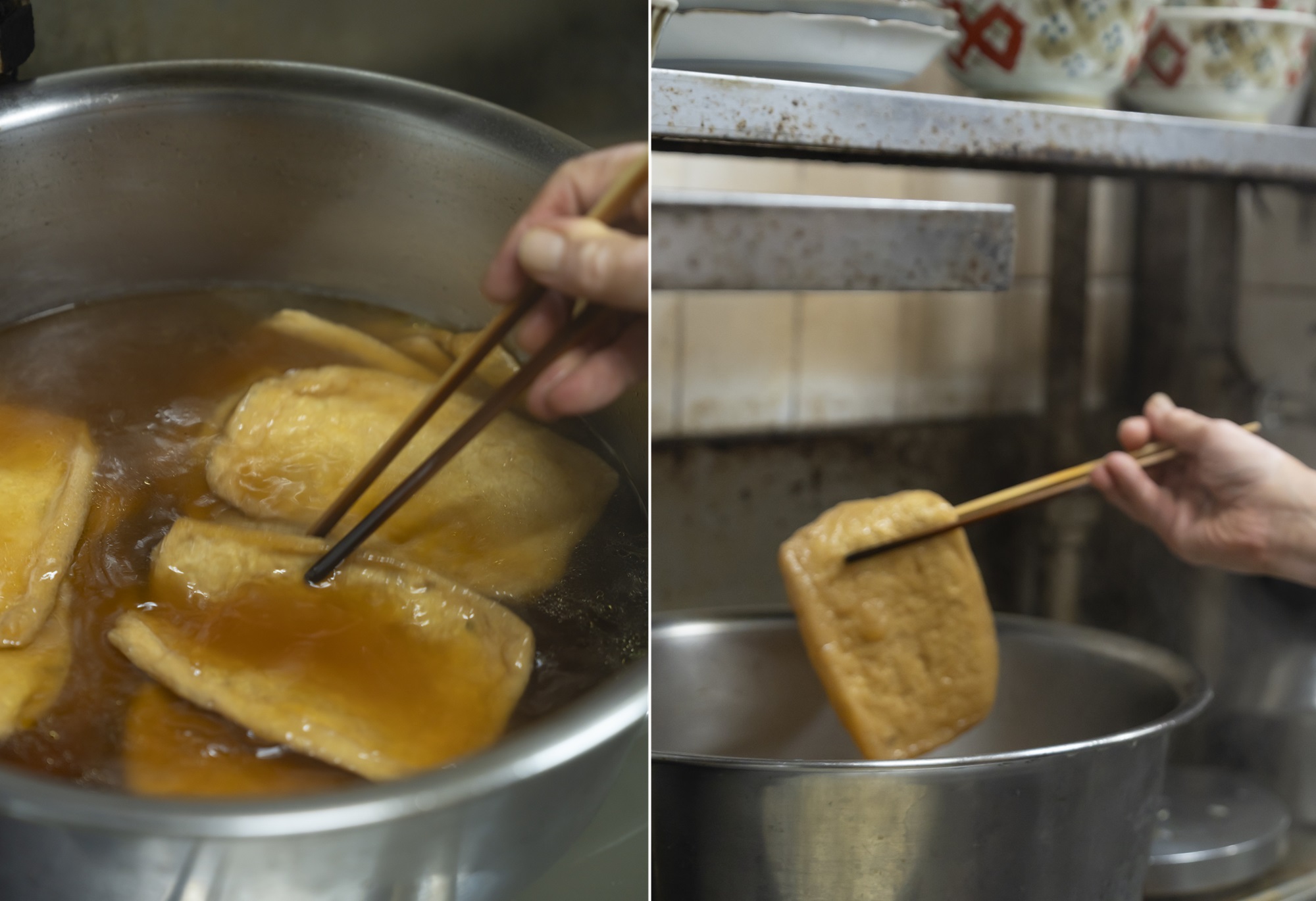 主役の油揚げは、大阪市内の豆腐屋さんから「ええもんを届けてもらってます」と3代目主人・宇佐美芳宏さん。