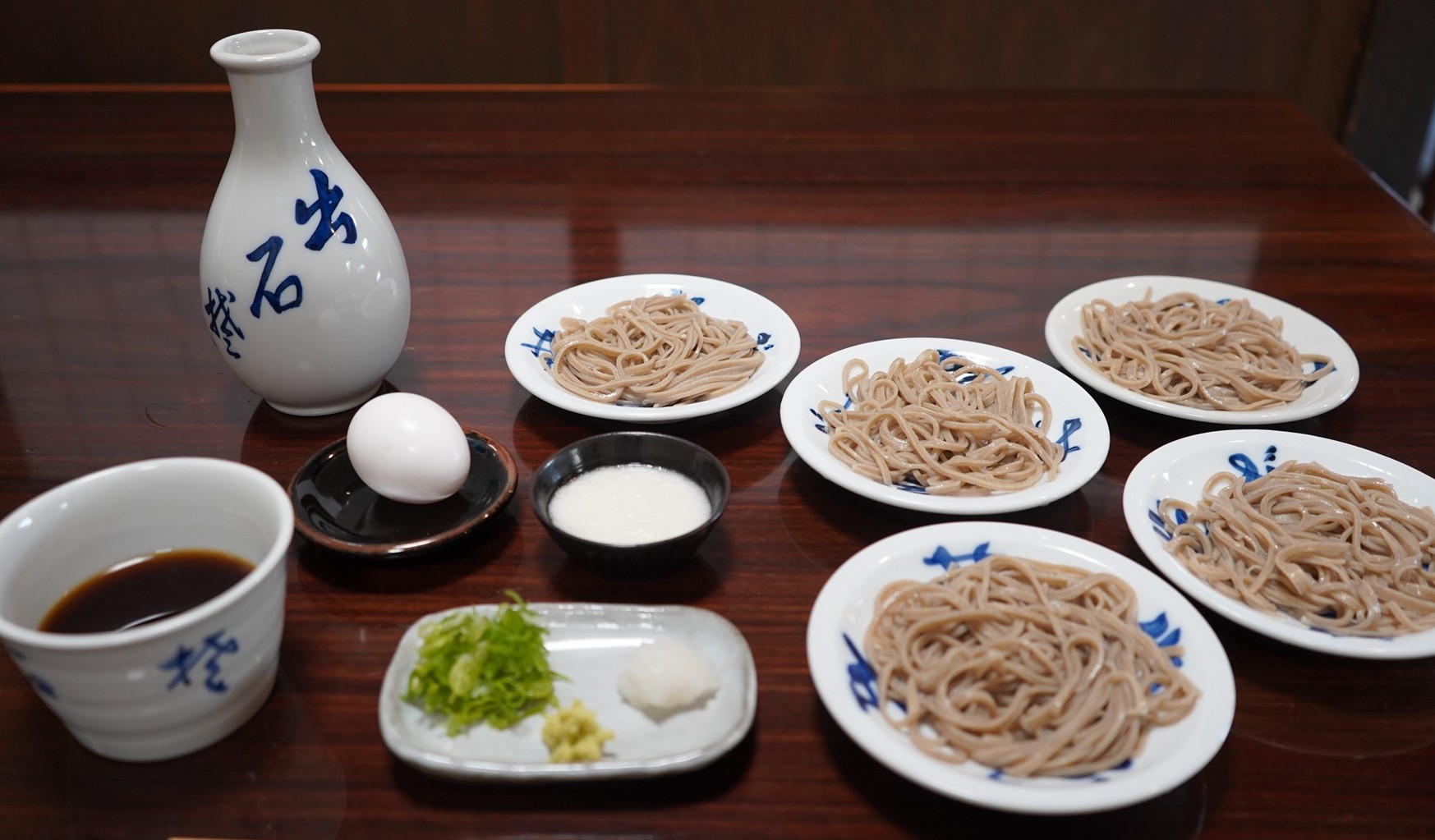 目の前に並べられた皿そばは、つやつやとしていて、食欲をそそります。徳利のそばつゆ、薬味の刻みネギ、大根おろし、ワサビ、とろろ、そして鶏卵。さてどうやって食べようと思案していると、「どうぞ好きに召し上がっていただいて、いいんですよ。そばを楽しんでくださいね」とお店の方に声を掛けていただきました。