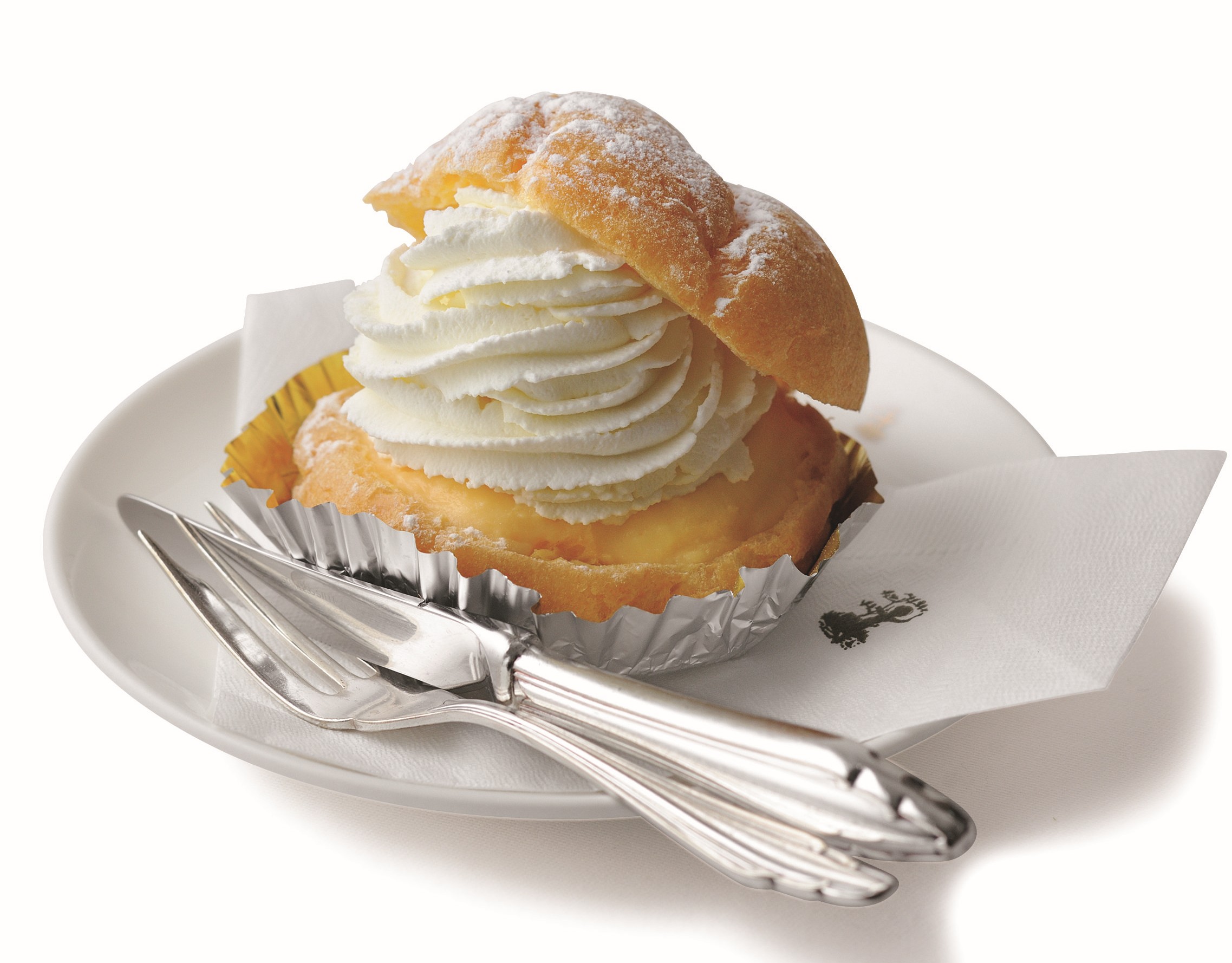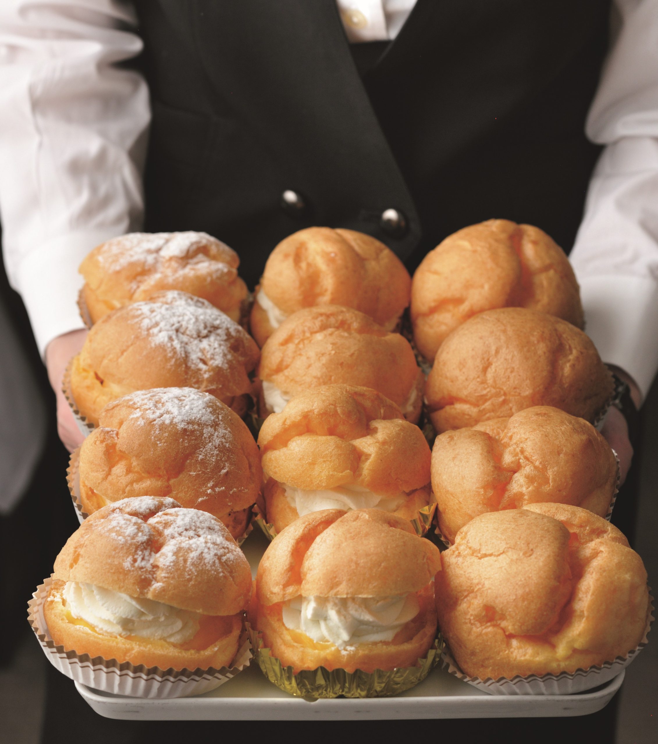 喫茶室限定のメニューとして加わった「ハーフ&ハーフシュー」は、つくりたての生クリームとカスタードクリームを、注文が入ってから厨房で詰めるサービスが大人気です。