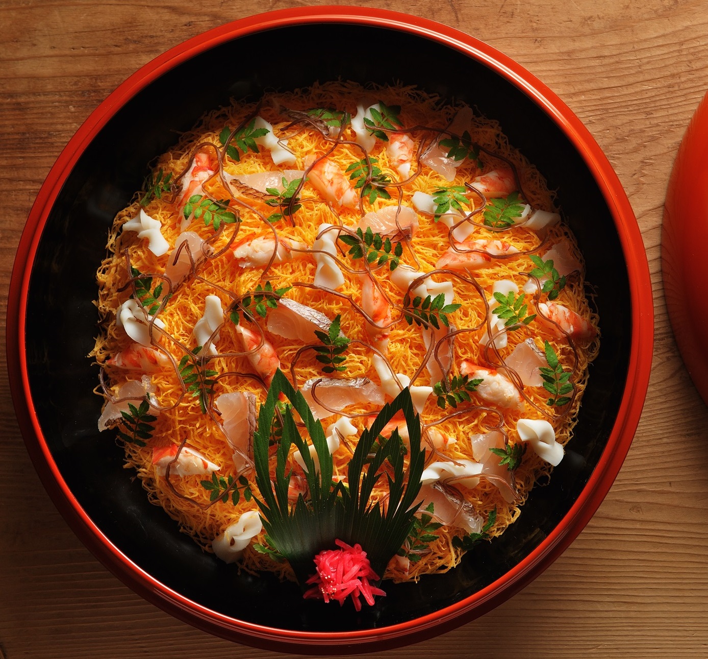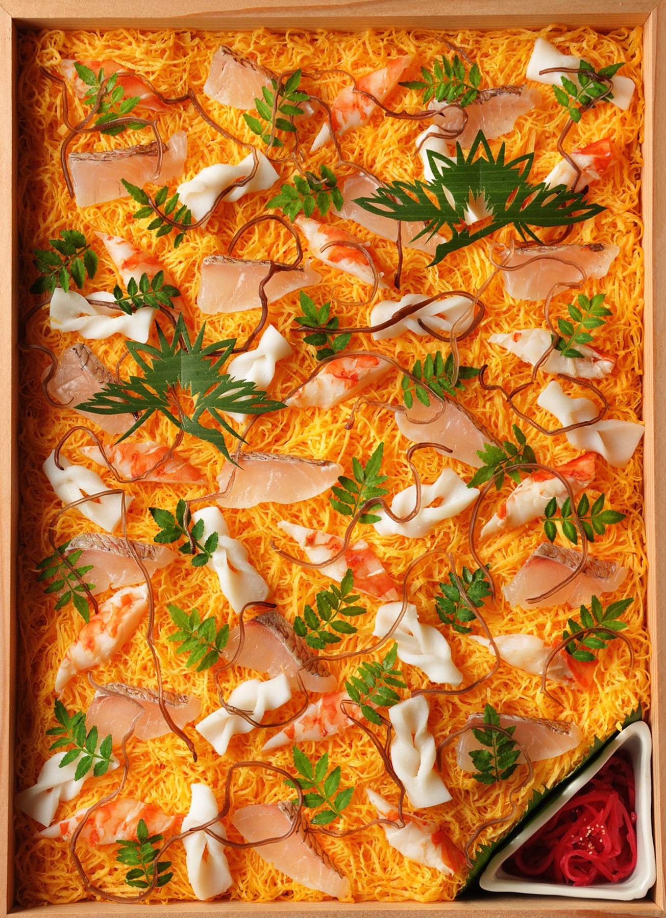 これぞ花街の出前寿司! お座敷の花に負けない華麗な寿司の姿です