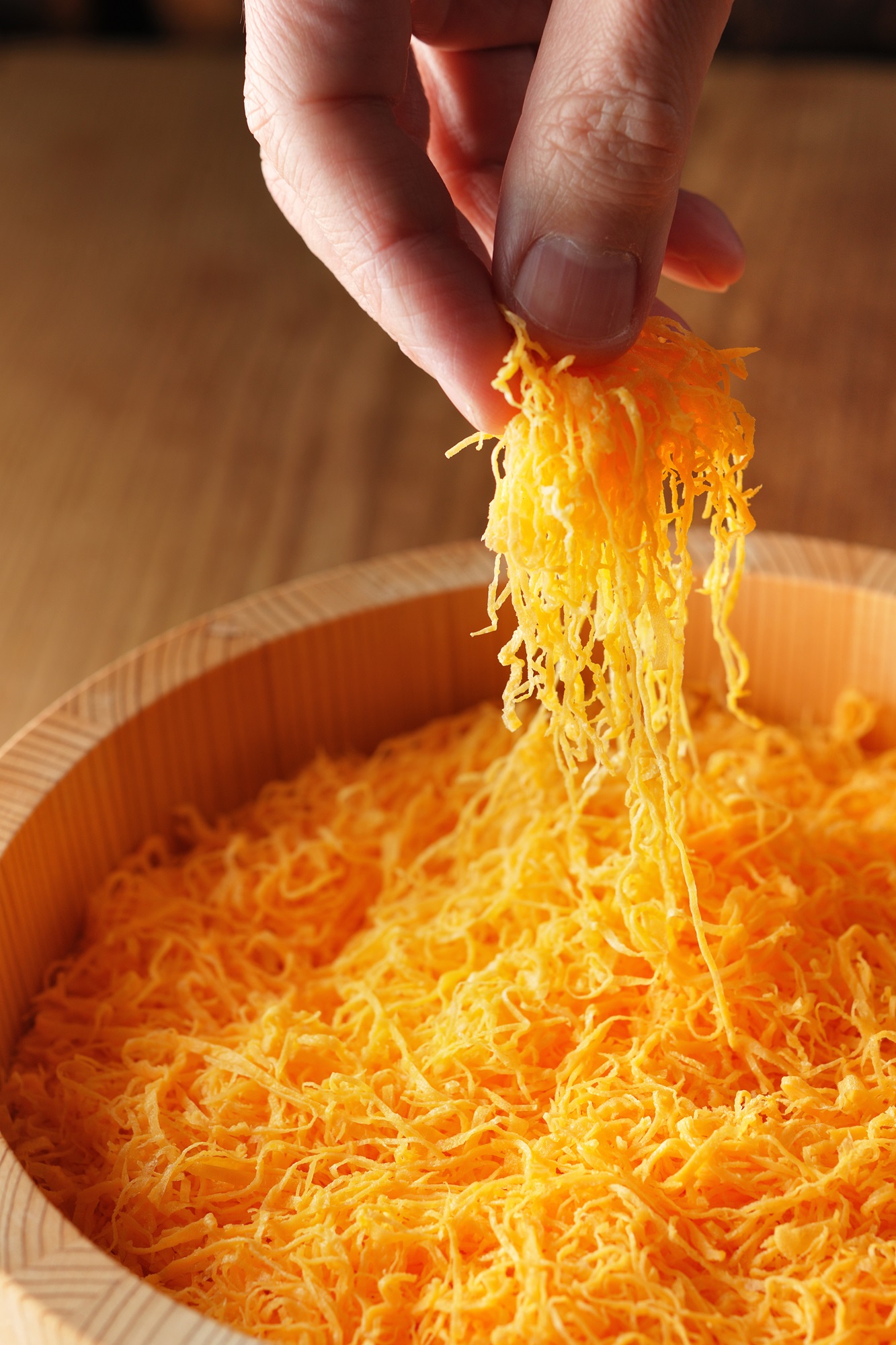 溶き卵は卵黄多めの配合に当代から変更。極細の錦糸玉子でも色が強い