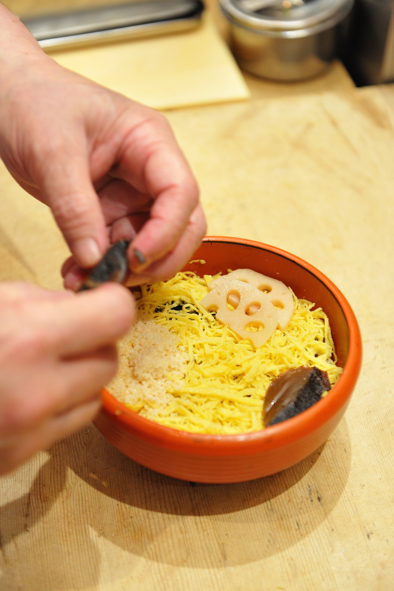そして寿司飯に入る、味わい深い〝ミンチ〟(どんこと干瓢〈かんぴょう〉を甘辛く炊いて刻んだ中具〈なかぐ〉 箱寿司のシャリにも入る)。