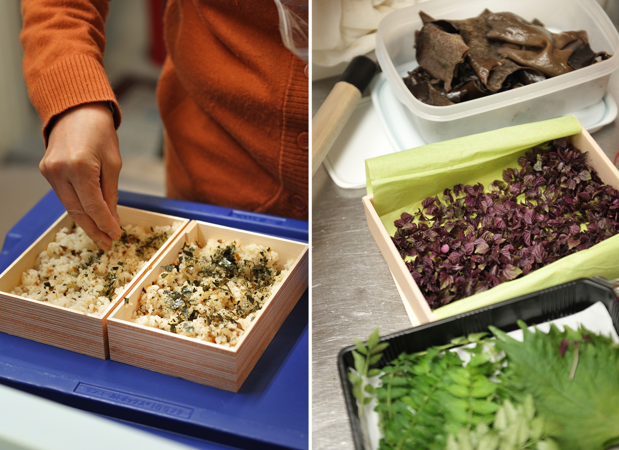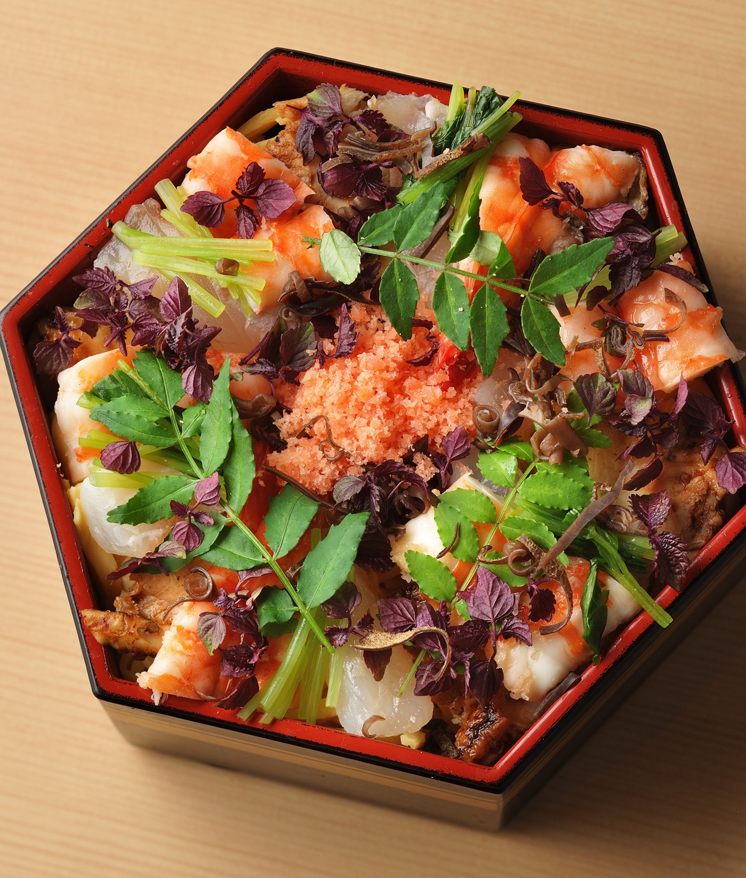 今でこそ料理に花やハーブをあしらう演出はあたりまえになりましたが、このちらし寿司が発売になったといわれる明治時代は、寿司の上に香りのものを散らす発想はまだありませんでした。