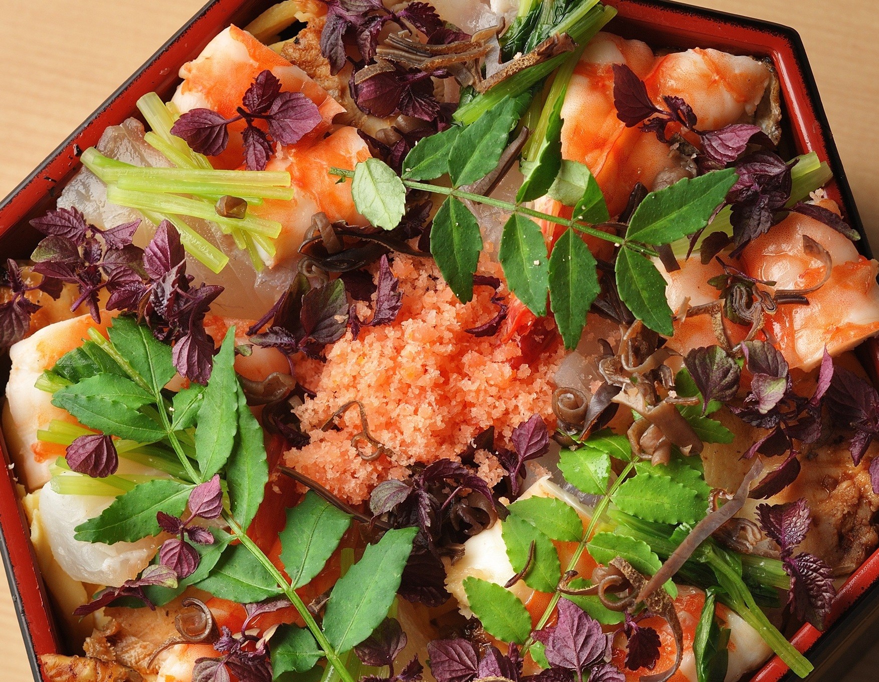 今でこそ料理に花やハーブをあしらう演出はあたりまえになりましたが、このちらし寿司が発売になったといわれる明治時代は、寿司の上に香りのものを散らす発想はまだありませんでした。