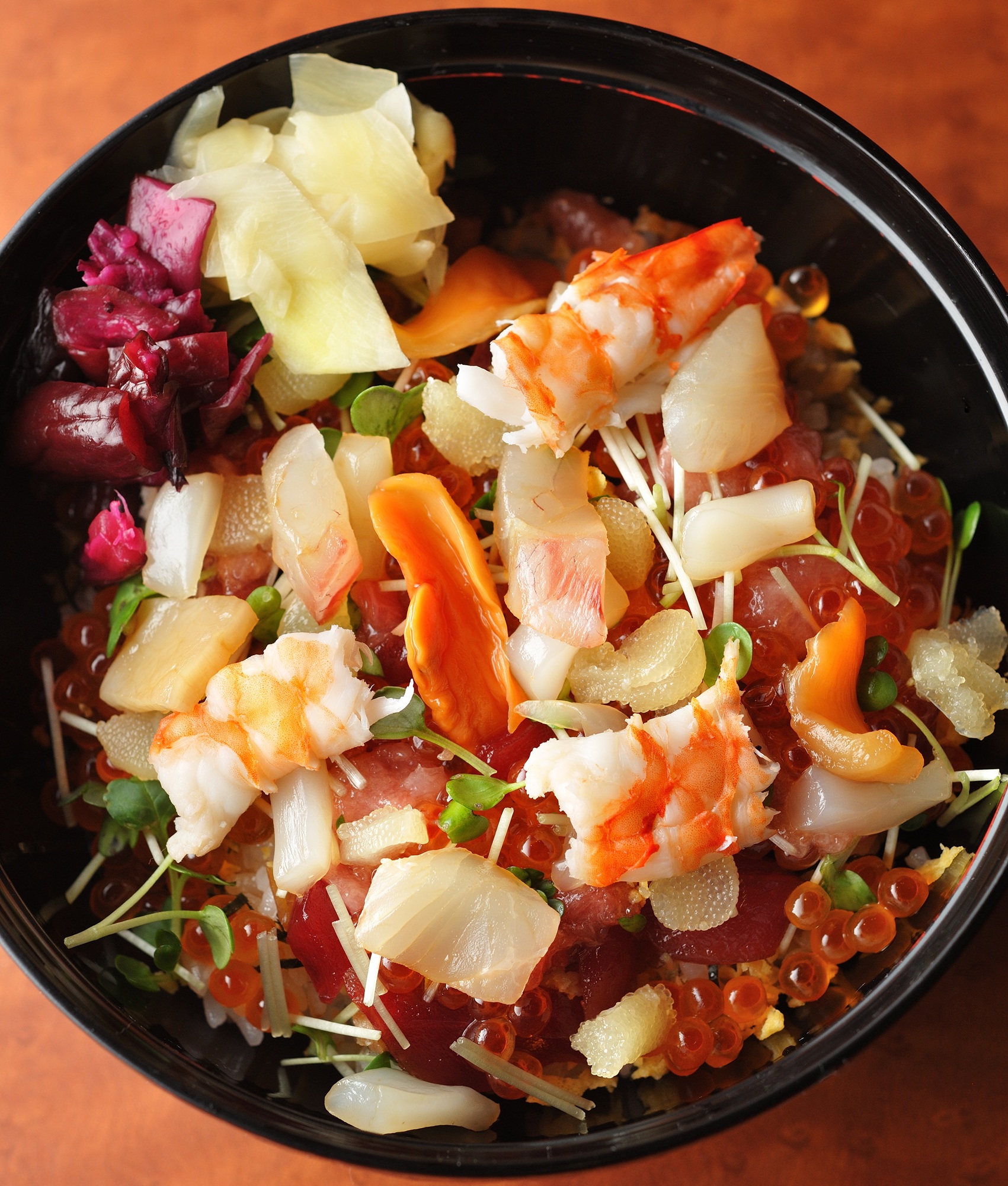 あらかじめ仕事をした(酢じめ、煮る、漬けるなど)ネタを、細かく刻んで寿司飯の上に見映えよく置いたこの寿司は、華麗な見た目に加え、口の中でさまざまな旨みが渾然(こんぜん)一体となるのが魅力です。