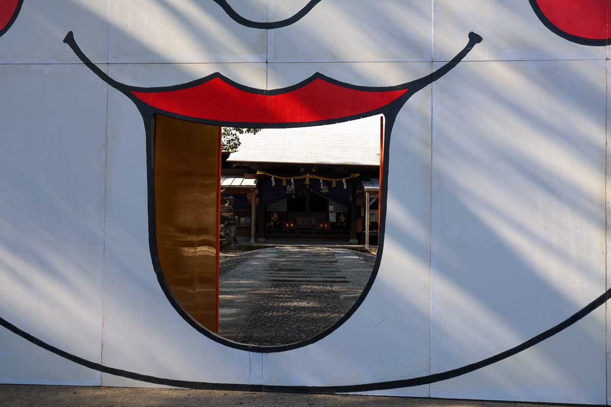 本来ならば、どっしりとした石の鳥居が見えるのだが。今は神社の扁額(へんがく)も含め巨大なお面にすっぽり隠れてしまっている。