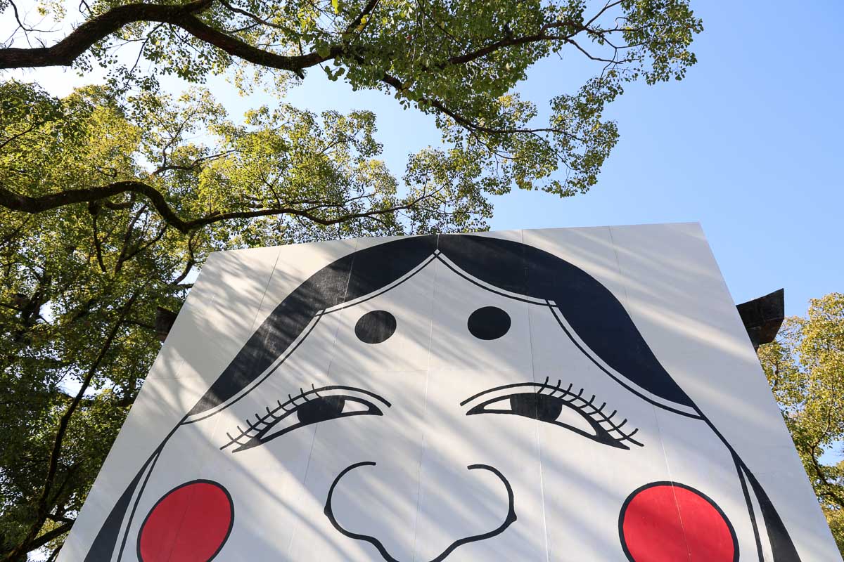 ちなみに、櫛田神社のお多福面はというと。木の枠に和紙を貼った造りとなっており、高さ5.3m、横幅5m。一方で、諫早神社のお多福面はパネル式。高さ、横幅共に5.6mと辛うじて大きい。