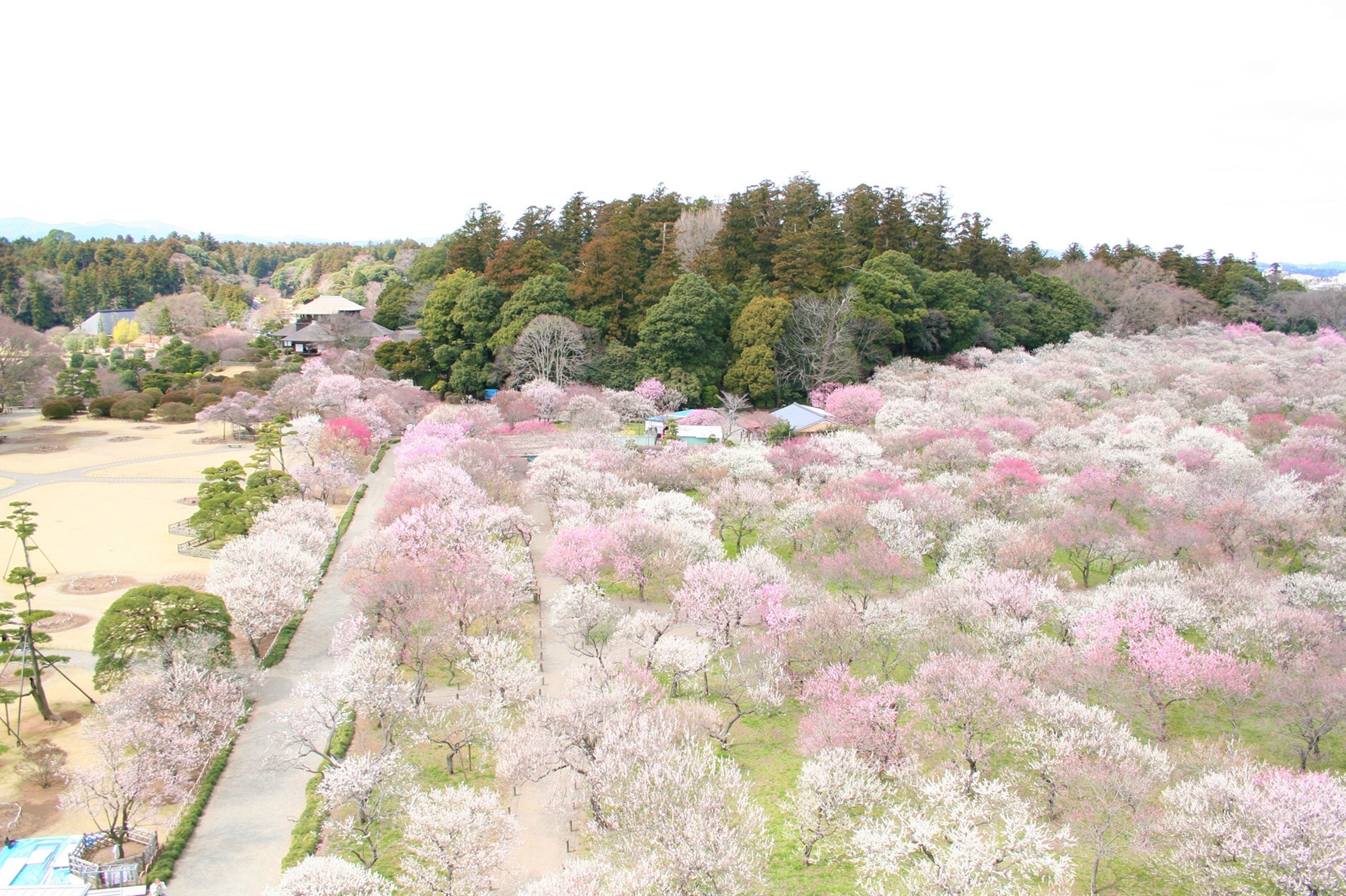 領民と楽しむ場としてつくられただけあり、早春の梅をはじめとした四季折々の花や眼下に広がる千波湖(せんばこ)の景観は圧巻。