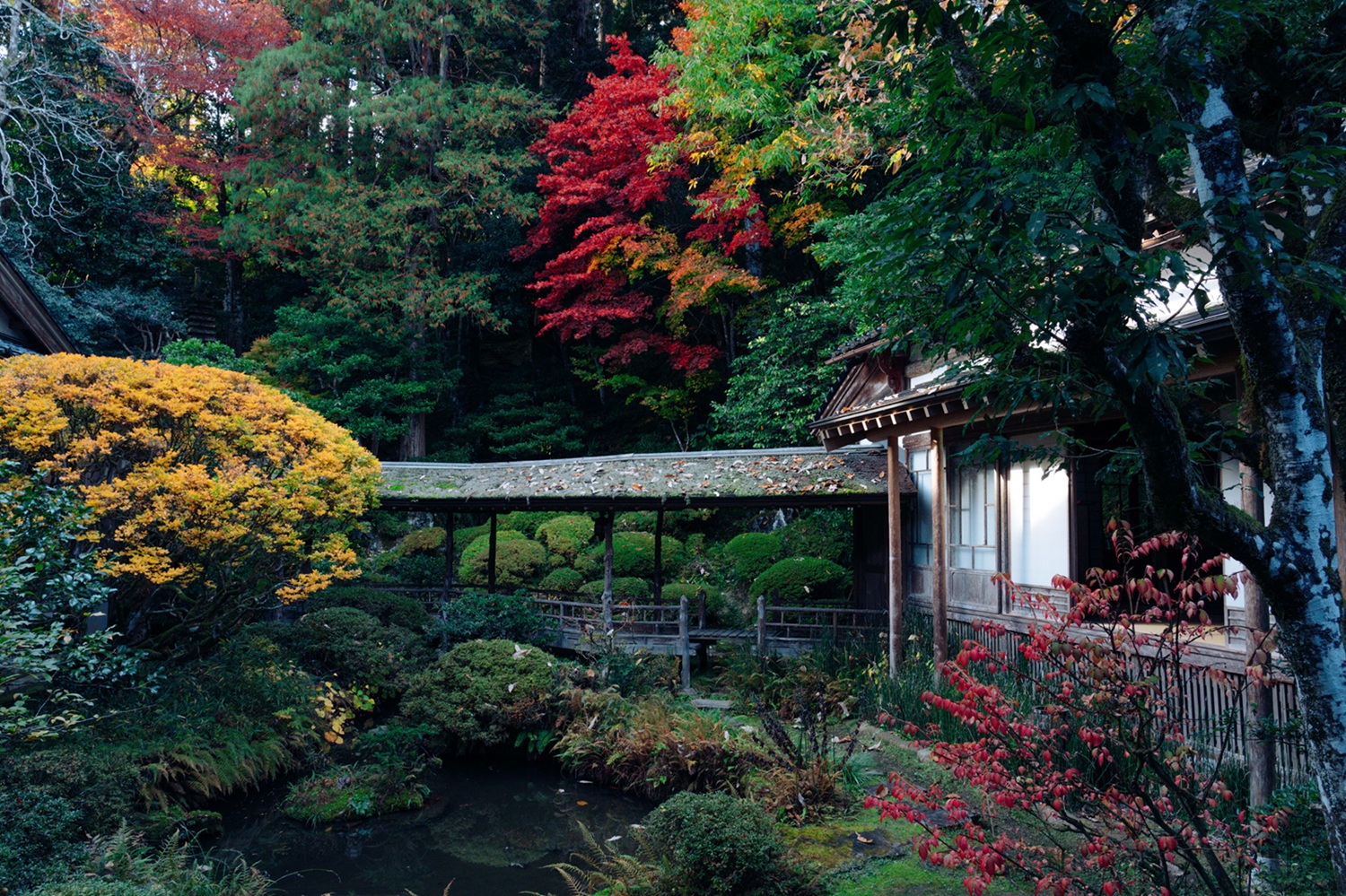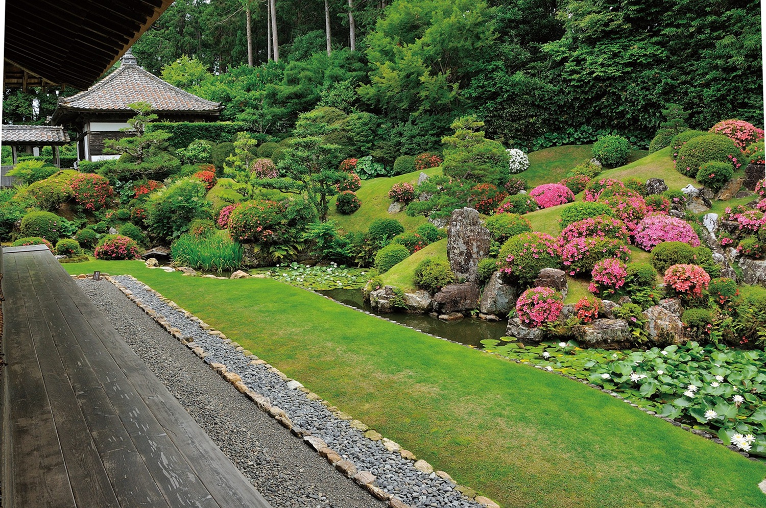 正和(しょうわ)3(1314)年に造園された庭は、臥龍池(がりょうち)と呼ばれる池に屋形付きの反り橋がかかり、浄土庭園の様式を感じさせる。