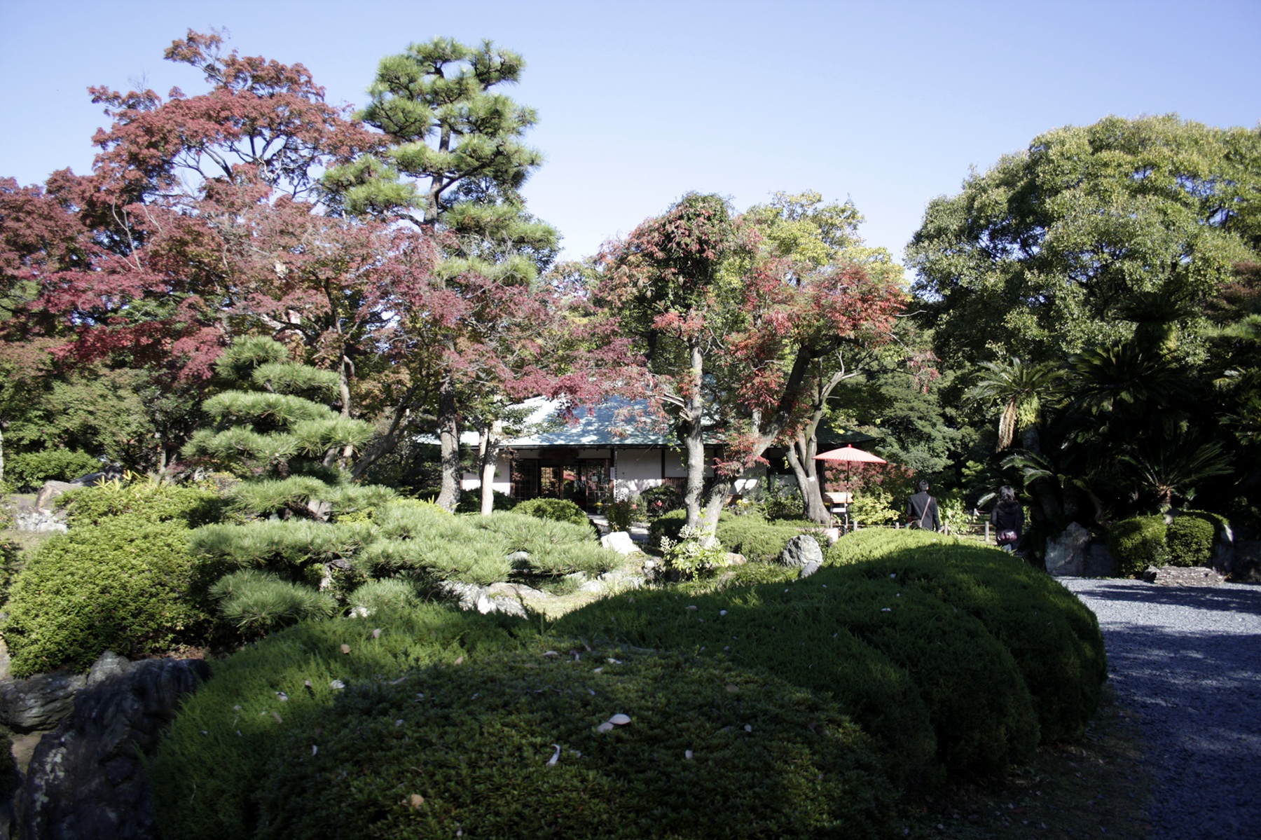 丸く刈り込まれたツツジやサツキ、紅葉百選にも選ばれているモミジなど、季節の見どころも。